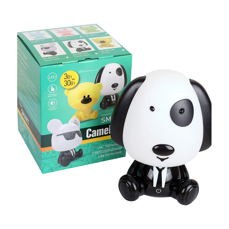 Декоративный светодиодный настольный светильник Camelion KD-895 предназначен для местной подсветки и украшения интерьера комнаты ребенка / подростка, может использоваться в качестве ночника. Используется во внутренних сухих помещениях. Корпус светильника изготовлен в виде забавной собаки в черном костюме, голова которой является плафоном. Сенсорная кнопка включения/выключения/регулировки яркости находится на передней части основания. Светильник абсолютно безопасен при использовании, в качестве источника света – светодиоды.