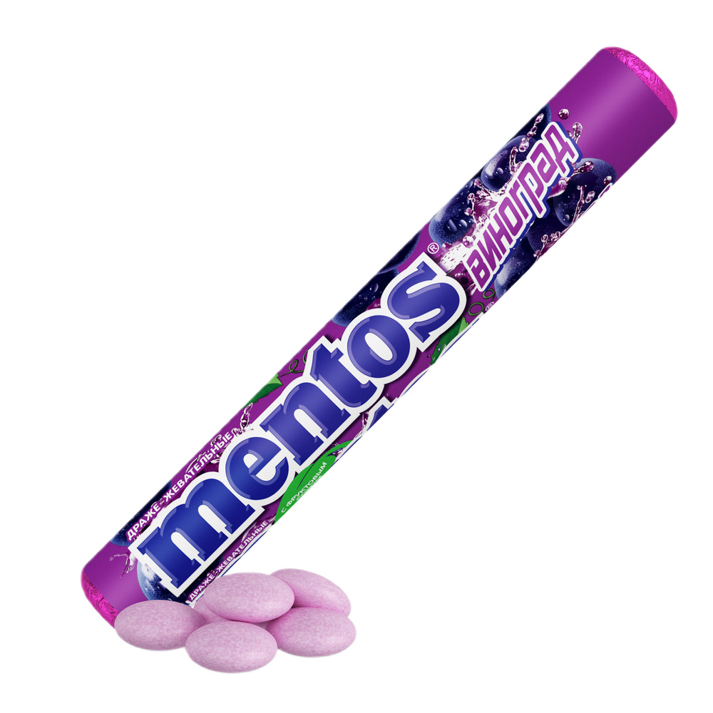 Жевательные драже Mentos Виноград – это вкусное и нежное лакомство в виде небольших конфет со вкусом винограда. Удобный формат упаковки жевательных драже в виде ролла позволяет всегда носить их с собой в небольшой сумке, рюкзаке или кармане. Драже Mentos станут отличным лакомством на работе или учебе, когда нужно сделать паузу и взбодриться.