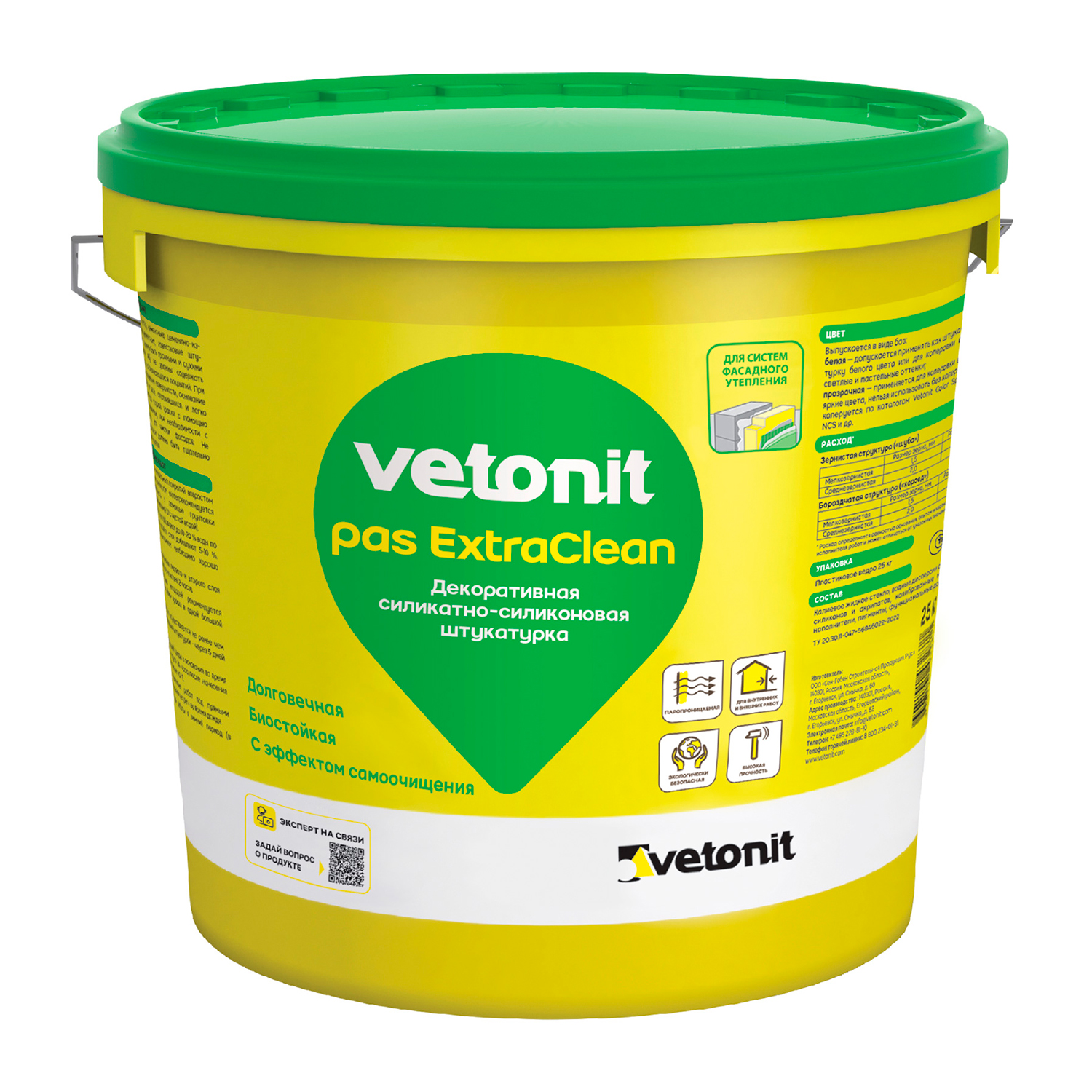 Высококачественная силикатно-силиконовая декоративная штукатурка Vetonit pas ExtraClean подходит для создания декоративно-защитного финишного слоя на поверхности систем фасадного утепления c минеральной (каменной и кварцевой) теплоизоляцией или пенополистиролом. Представлена в фактуре «шуба» с размером зерна от 1,5 до 2 мм. Обладает эффектом самоочищения, защищает стену от образования грибка и плесени — идеально подходит для декоративного слоя на фасаде.