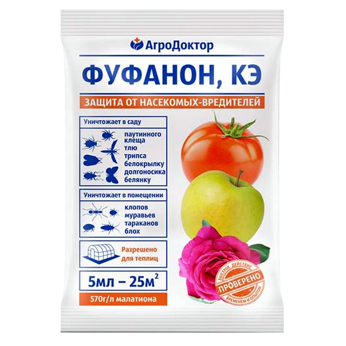 Агродоктор-фуфанон - эффективное средство для защиты сельскохозяйственных культур от насекомых-вредителей (паутинного клеща, тли, белокрылки, долгоносика, трипс, белянки). Также подходит для уничтожения: клопов, муравьев, тараканов, блох. Препарат обладает фумигантным действием, не токсичен в рекомендованных дозах. Период защитного действия: несколько дней после обработки.