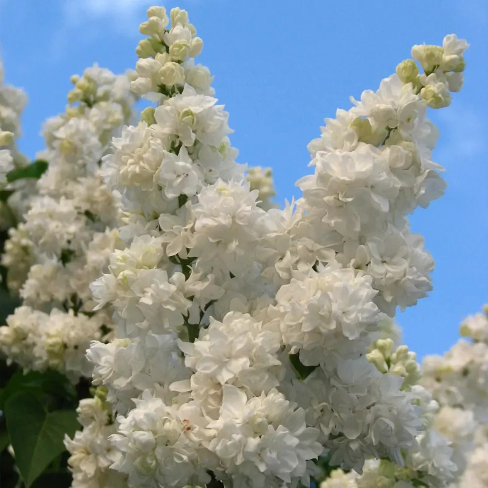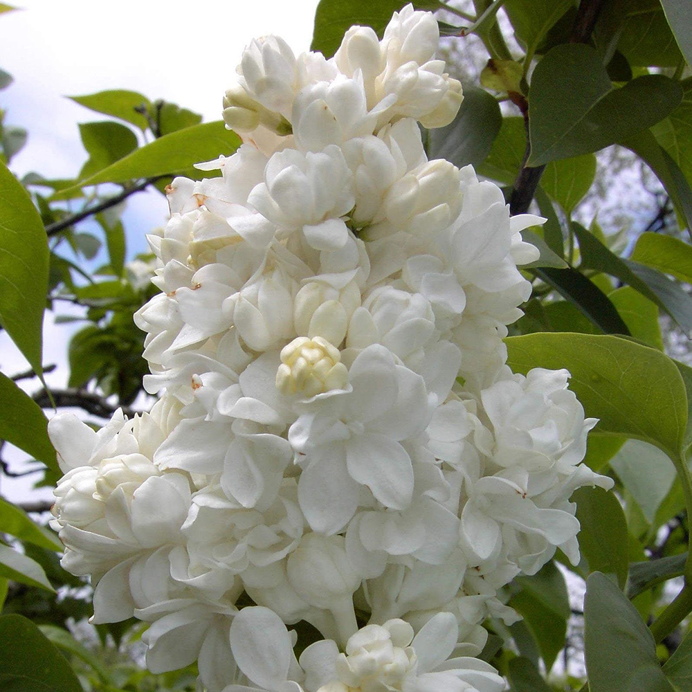 Бутоны кремовые, слегка зеленоватые; цветки чисто белые, очень крупные, густомахровые, слегка душистые. Соцветия чаще из одной пары метёлок, прячущихся в листве. Один из самых эффектных сортов с цветками и бутонами редкой красоты.