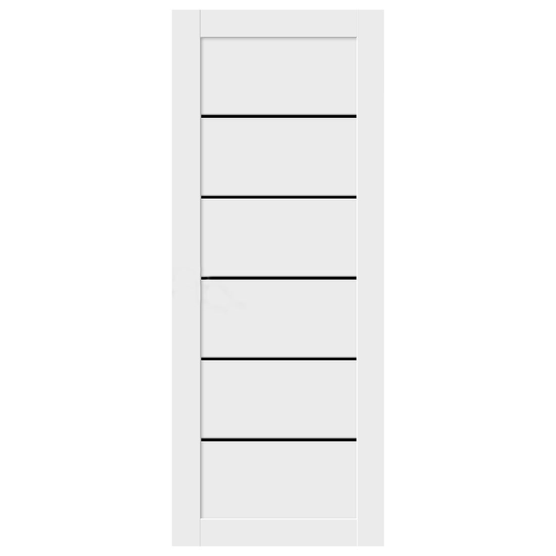 Межкомнатное царговое полотно, остекленное универсальное. Покрытие экошпон (ПВХ), матовое, гладкое. Обвязка полотна из царговых элементов. Внутренняя наборка - МДФ вставки + стекло лакобель черное. Полотно поставляется без фурнитуры и врезки под нее. Используется бескромочная технология.