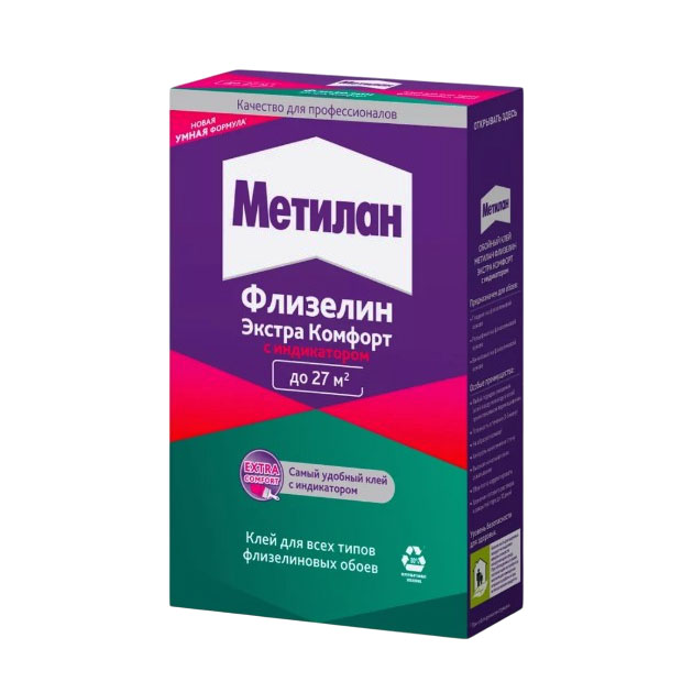 Обойный клей Метилан Флизелин Экстра Комфорт для флизелиновых обоев, предназначен для флизелиновых обоев. Его главным преимуществом является новая умная формула для более комфортного процесса поклейки обоев. Клей легко развести, комки не появятся даже при добавлении воды в клей (при интенсивном перемешивании). Продукт обладает высокой начальной силой схватывания, а при неровном наклеивании обоев в течение 15 минут их можно легко корректировать. Стоит обратить внимание на новый дизайн пачки, который так же привлечёт к себе внимание потребителей.