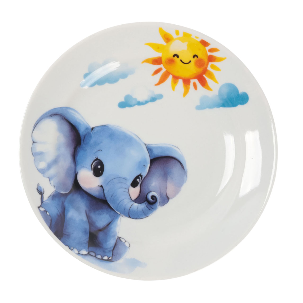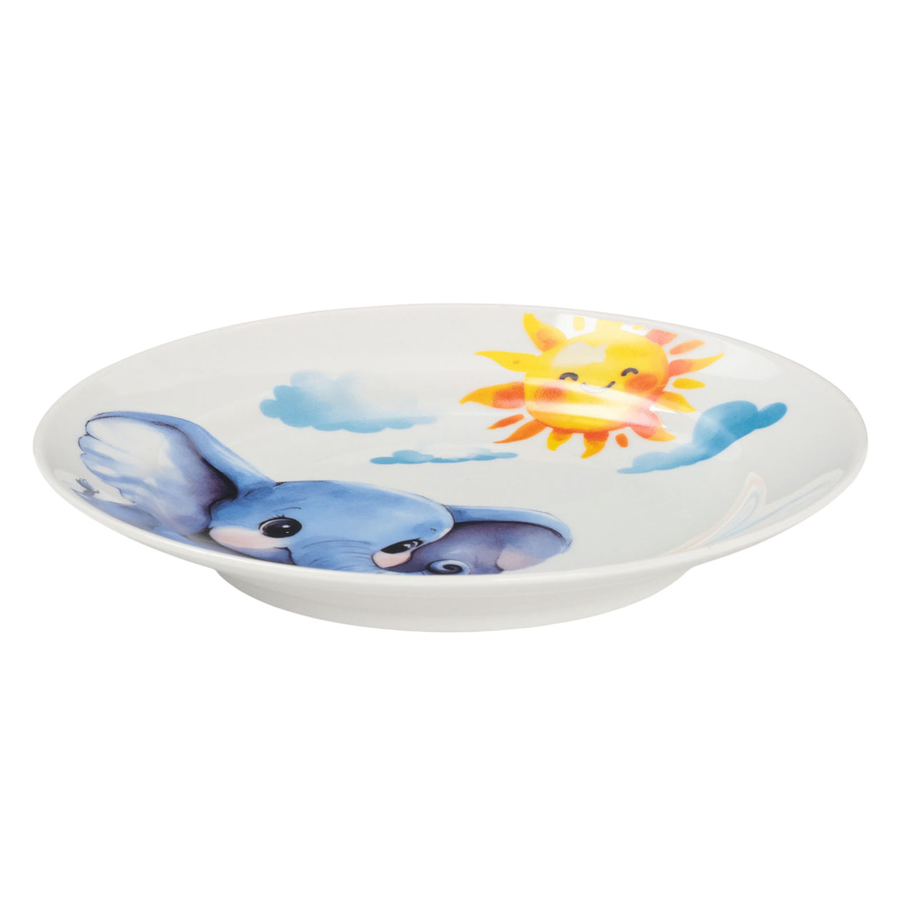 Тарелка мелкая диам. 175 мм Гладкий край Слоник изготовлена из фарфора. Благодаря милому рисунку, она превращает обычную трапезу в увлекательное занятие. Можно использовать в СВЧ-печи и мыть в посудомоечной машине. Для детей старше 3 лет.