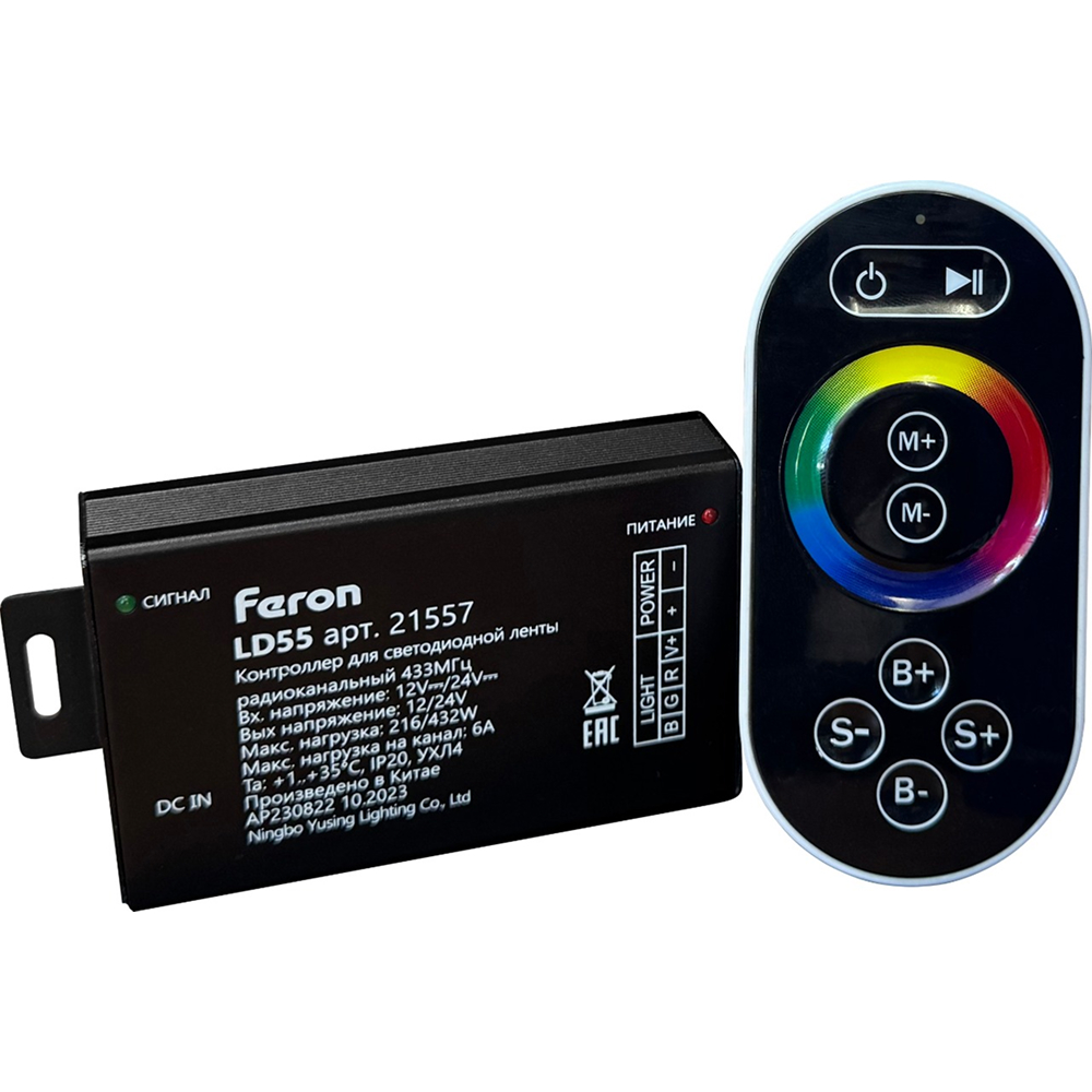 FERON LD55 RGB представляет собой универсальный контроллер, предназначенный специально для эффективного управления современными LED-лентами, работающими от напряжения 12–24 вольта. Устройство оснащено удобным дистанционным управлением, позволяющим настраивать подсветку на расстоянии до 30 метров.