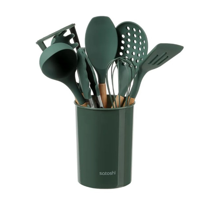 Набор кухонных принадлежностей SATOSHI Эрно — практичный и стильный комплект для кухни, выполненный в зеленом цвете с деревянными ручками. Набор включает 10 предметов из термостойкого силикона, безопасного для посуды с антипригарным покрытием: толкушку для картофеля, поварскую ложку, щипцы, ложку для спагетти, половник, лопатку с прорезями, кулинарную кисточку, подставку, венчик и ложку с прорезями. Деревянные ручки обеспечивают удобство использования, добавляя приятные тактильные ощущения и надежный хват. Они легкие, экологичные и придают инструментам дополнительную прочность, делая процесс готовки более комфортным.
