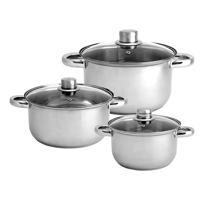В состав набора входят: кастрюля с крышкой на 1,7 л; кастрюля с крышкой на 2,2 л; кастрюля с крышкой на 3,2 . Кастрюли изготовлены из высококачественной нержавеющей стали марки AISI 201, имеют крышку из термостойкого стекла. Внутри каждой кастрюли есть мерная шкала для удобства приготовления. Подходят под любые типы плит, в том числе индукционные.