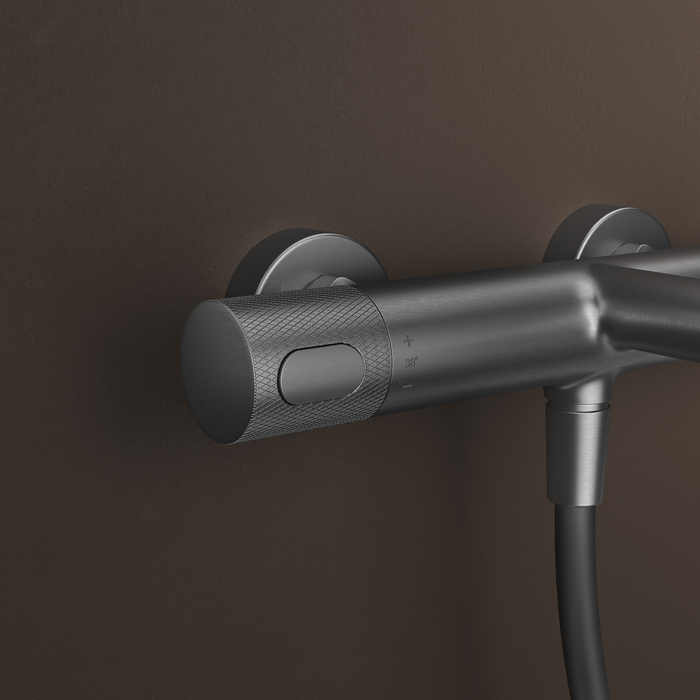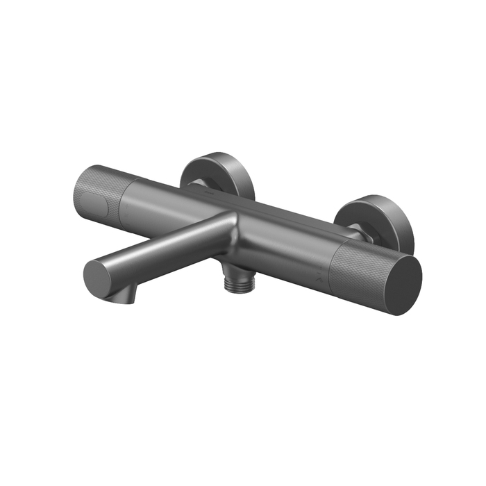 Смеситель для ванны с термостатом Duna – воплощение актуальных трендов в дизайне смесителей в безупречном исполнении: фрезеровка, модные цвета и фактуры. Без душевых аксессуаров в комплекте. Ручка выполнена из латуни для сохранения чёткости линий фрезеровки. Европейские комплектующие и технологии — для премиального качества.