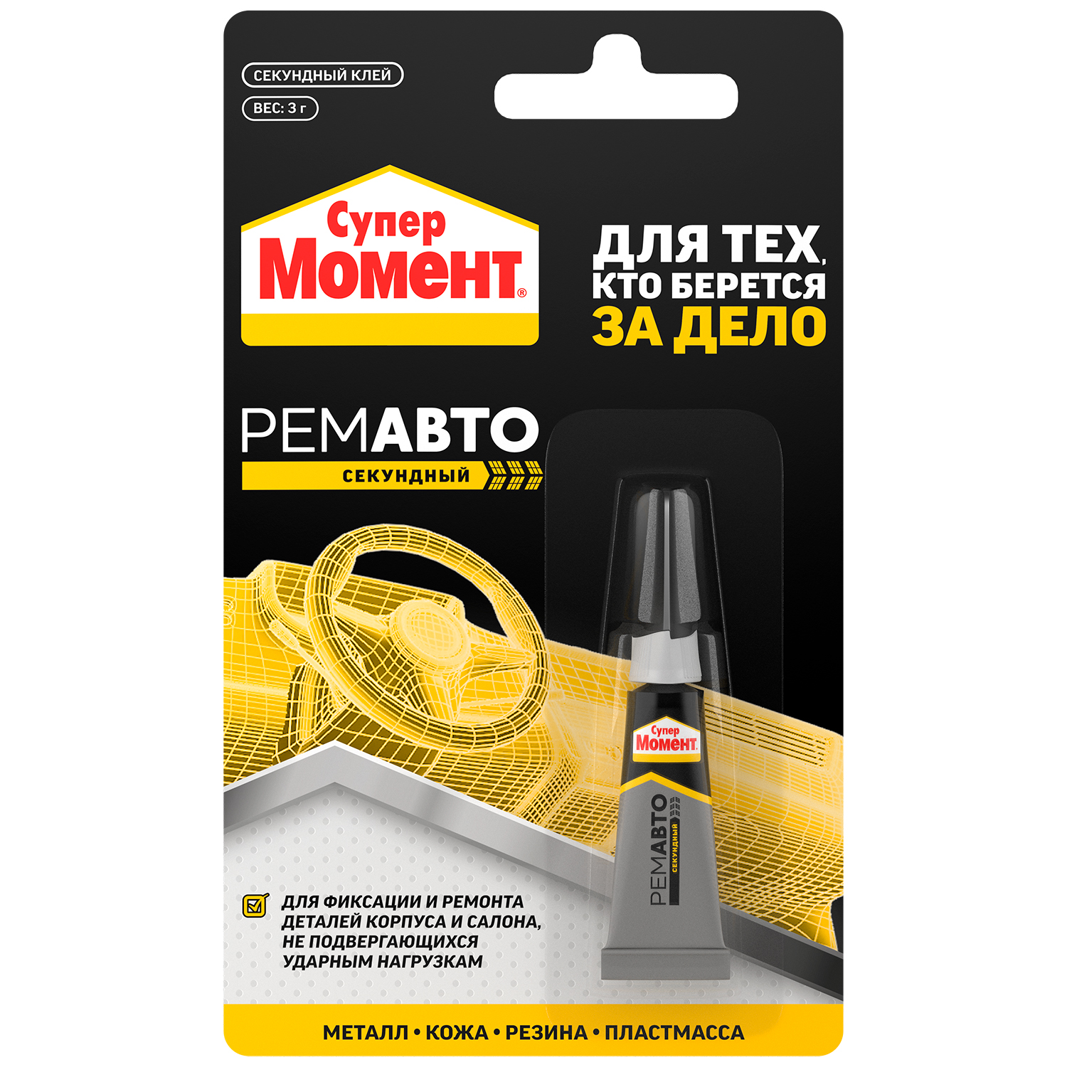 Клей Супер МОМЕНТ РемАвто секундный идеален для локального авторемонта — фиксации и ремонта деталей корпуса и салона, не подвергающихся ударным нагрузкам. Начальная прочность склеивания настолько велика, что склеенное изделие можно использовать через несколько минут. Окончательная прочность склеивания может достигать 200 кг/см² в зависимости от материалов (усилие на разрыв). Совместим с кожей, резиной, пластмассой, металлом.