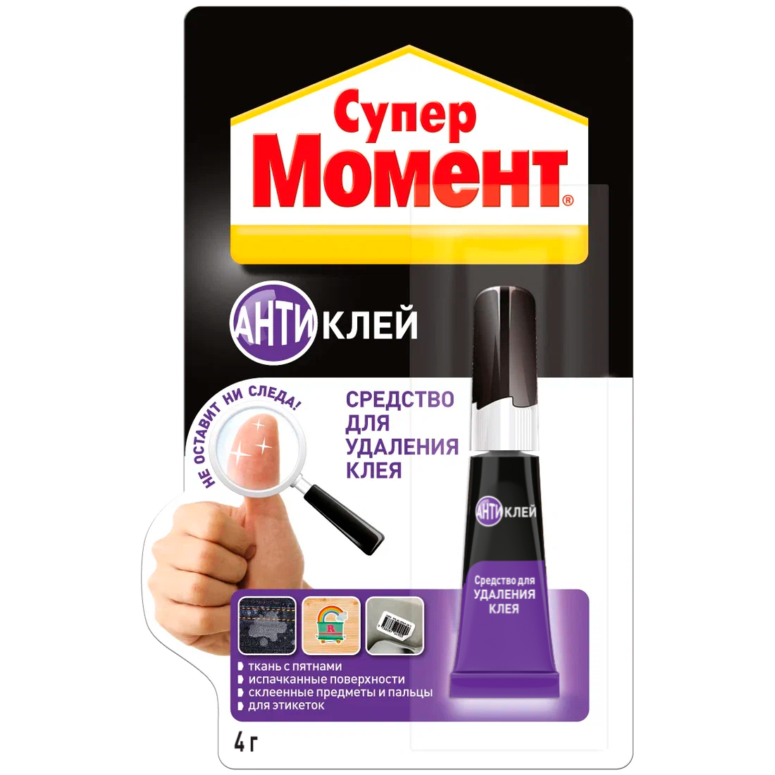 Супер МОМЕНТ Антиклей — средство, предназначенное для удаления пятен и излишков застывшего секундного клея (супер клея) и ряда других клеев. Легко и быстро очищает большинство видов клея. Изготовлено в форме густого геля — не растекается. Легко наносить даже на вертикальные поверхности.