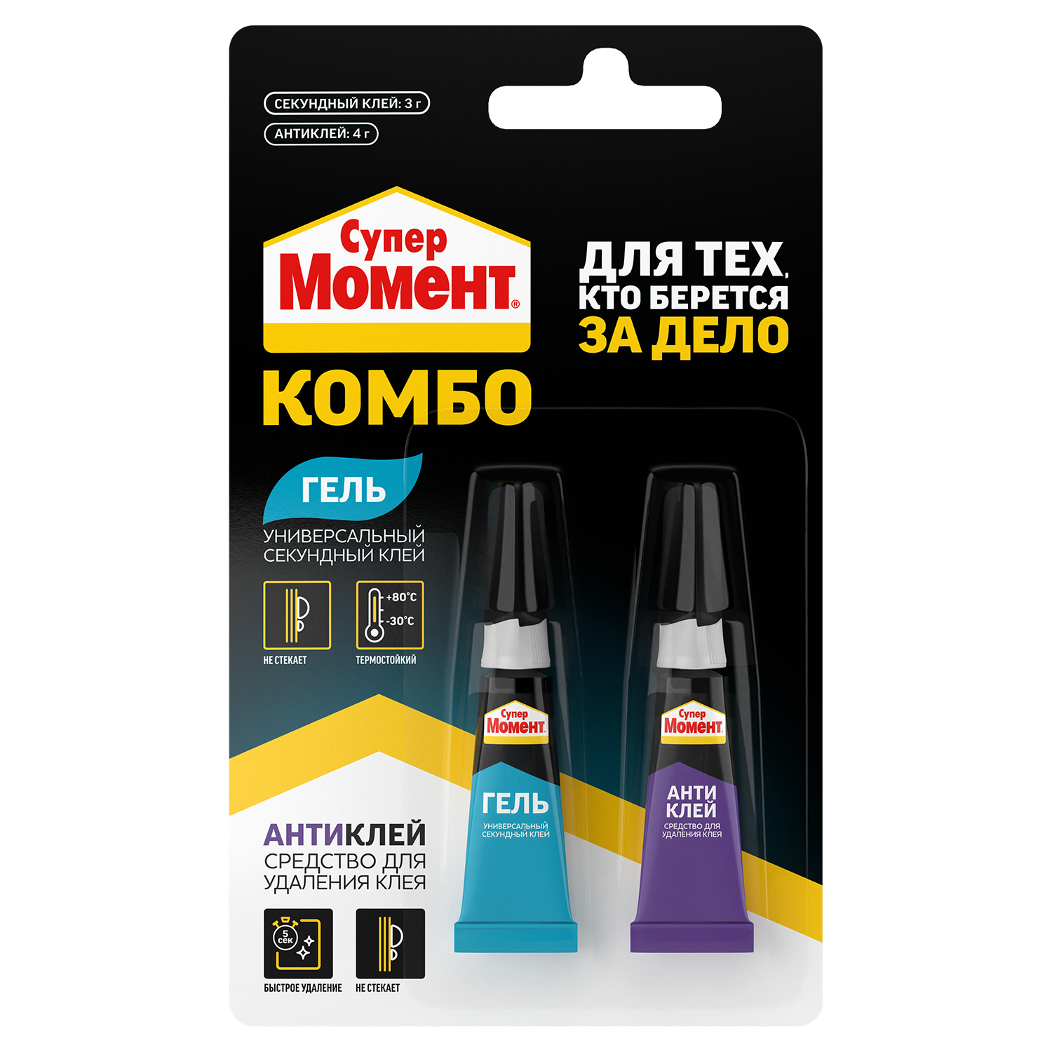 Супер МОМЕНТ Комбо — уникальное предложение для быстрого и эффективного ремонта, объединяющее в себе две необходимые вещи: секундный клей-гель и средство для удаления клея (антиклей). Такой комплект позволит оперативно решить любые бытовые задачи по ремонту и обслуживанию изделий, будь то мебель, обувь или аксессуары.