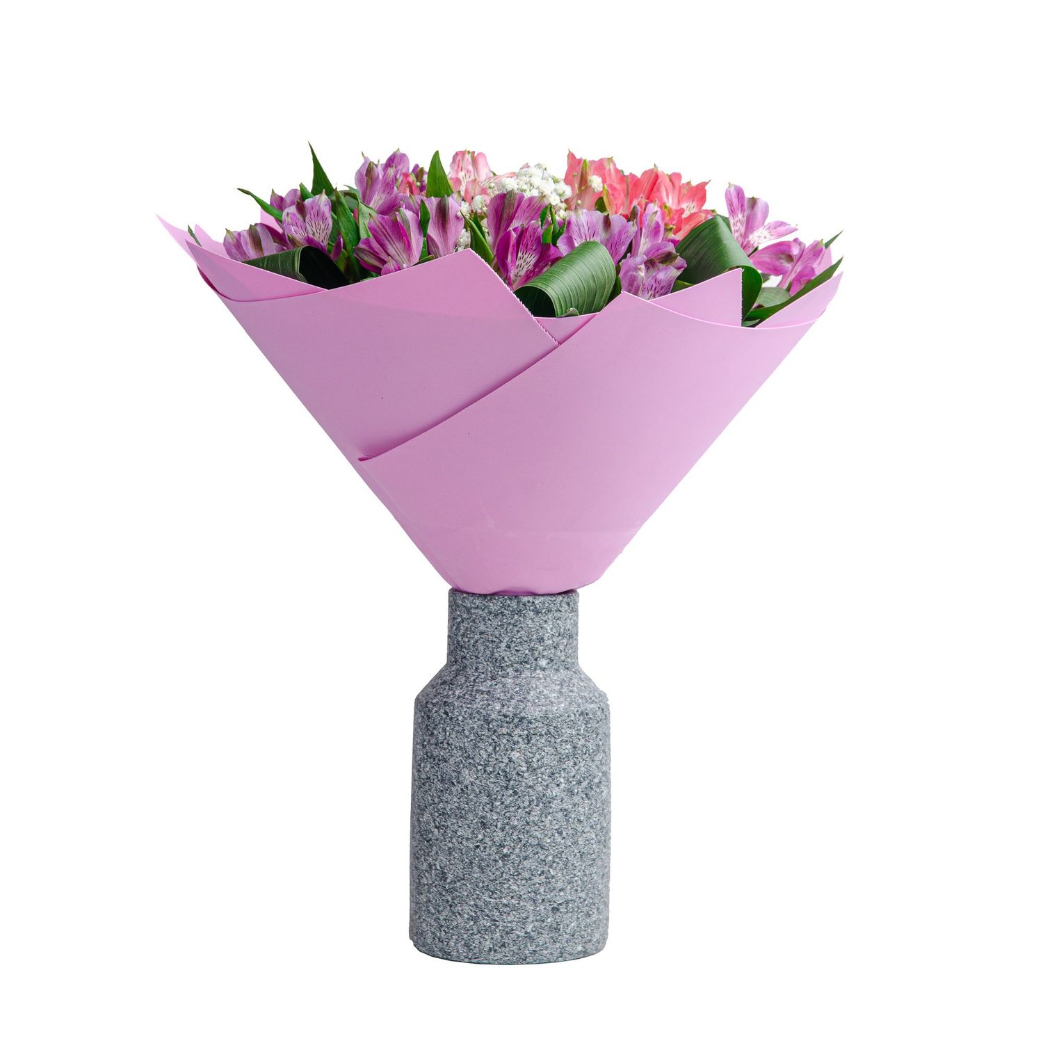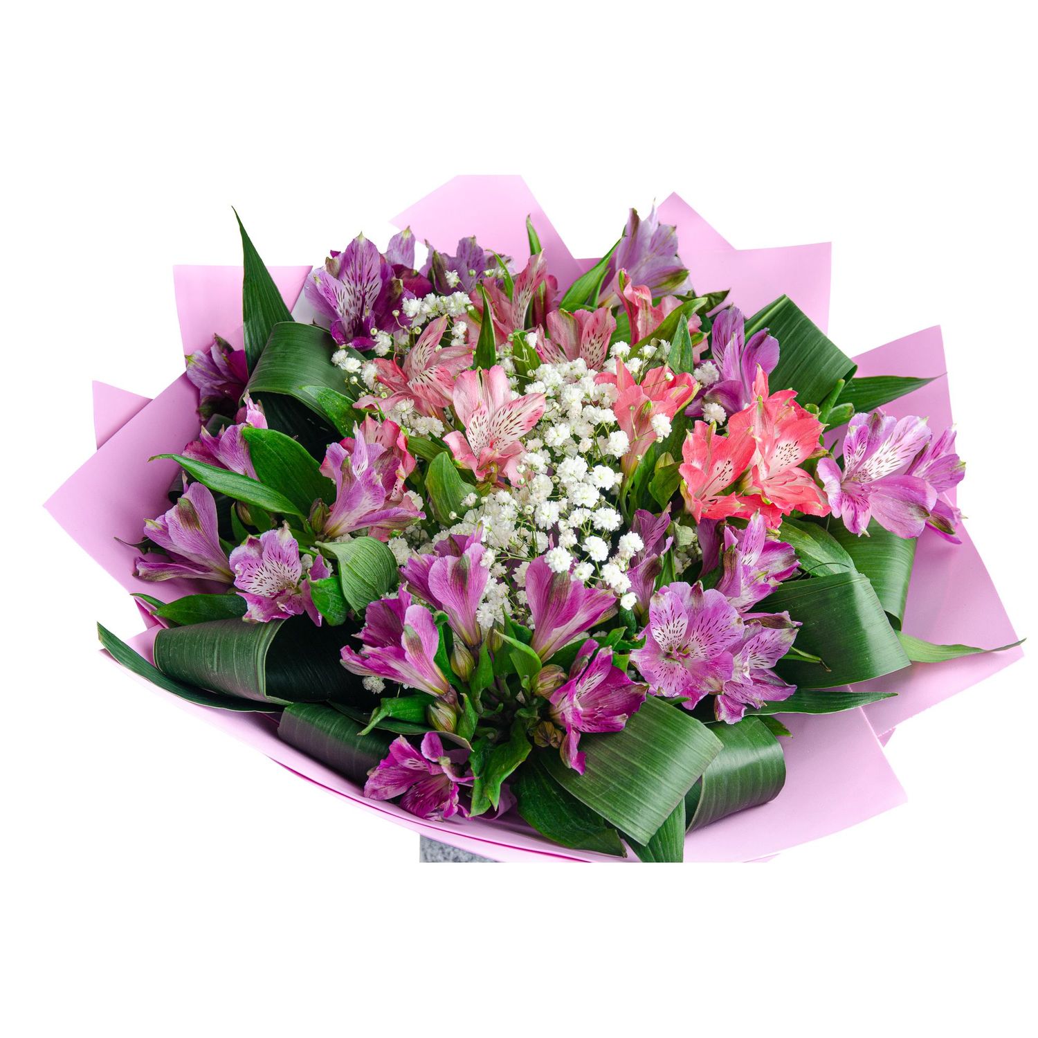 Яркий букет из альстромерии, гипсофилы и аспидистры. Эффектный букет в насыщенных тонах сочетает альстромерию Батиан фиолетовую и красную — благородные оттенки создают контраст, наполняя композицию энергией и страстью. Воздушная гипсофила смягчает яркость, добавляя легкость, а глянцевые листья аспидистры завершают образ, придавая ему элегантность.