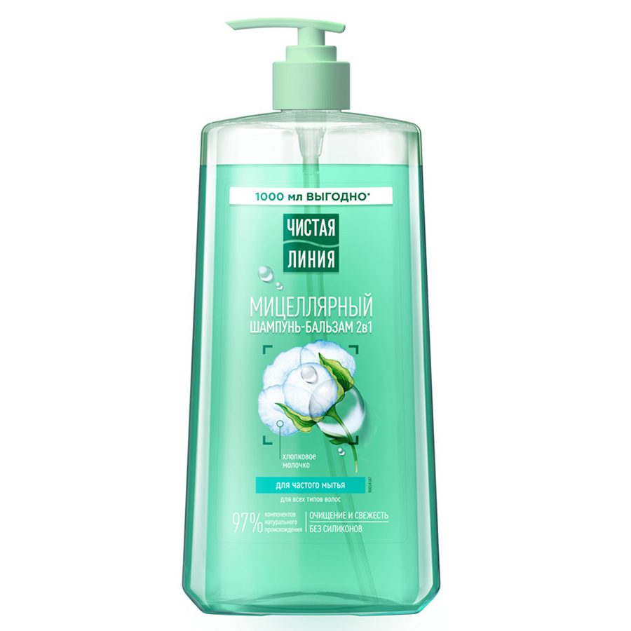 Шампунь и бальзам для волос женский Чистая линия с хлопковым молочком обеспечит вашим прядям бережное очищение и свежесть. Мицеллярный шампунь для волос женский 2в1 на 97% состоит из компонентов натурального происхождения. Бальзам-ополаскиватель для волос женский не имеет в своем составе силиконов, разработан на основе мицеллярной формулы с 5-ю экстрактами: крапивы, ромашки, зверобоя, чистотела и тысячелистника.