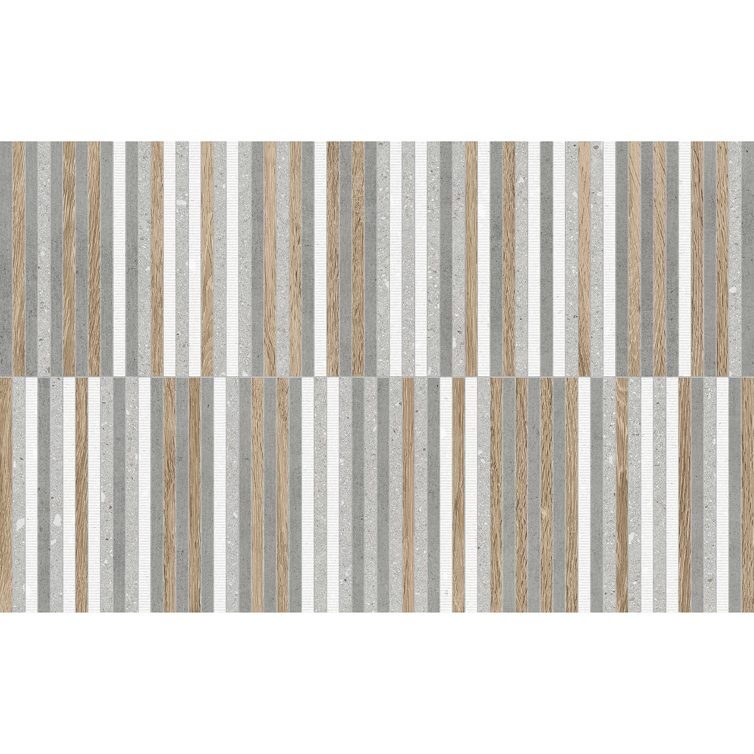 Текстура бетона представлена в универсальном сером цвете с матовой поверхностью. Текстура дерева выполнена в тёплом коричневом оттенке, передающем естественную красоту древесных волокон. Связующим акцентом коллекции является декоративный фон, который объединяет обе эти текстуры. Паттерн декора выполнен в виде ритмичных вертикальных тонких полос, создающих динамику и визуальный интерес.