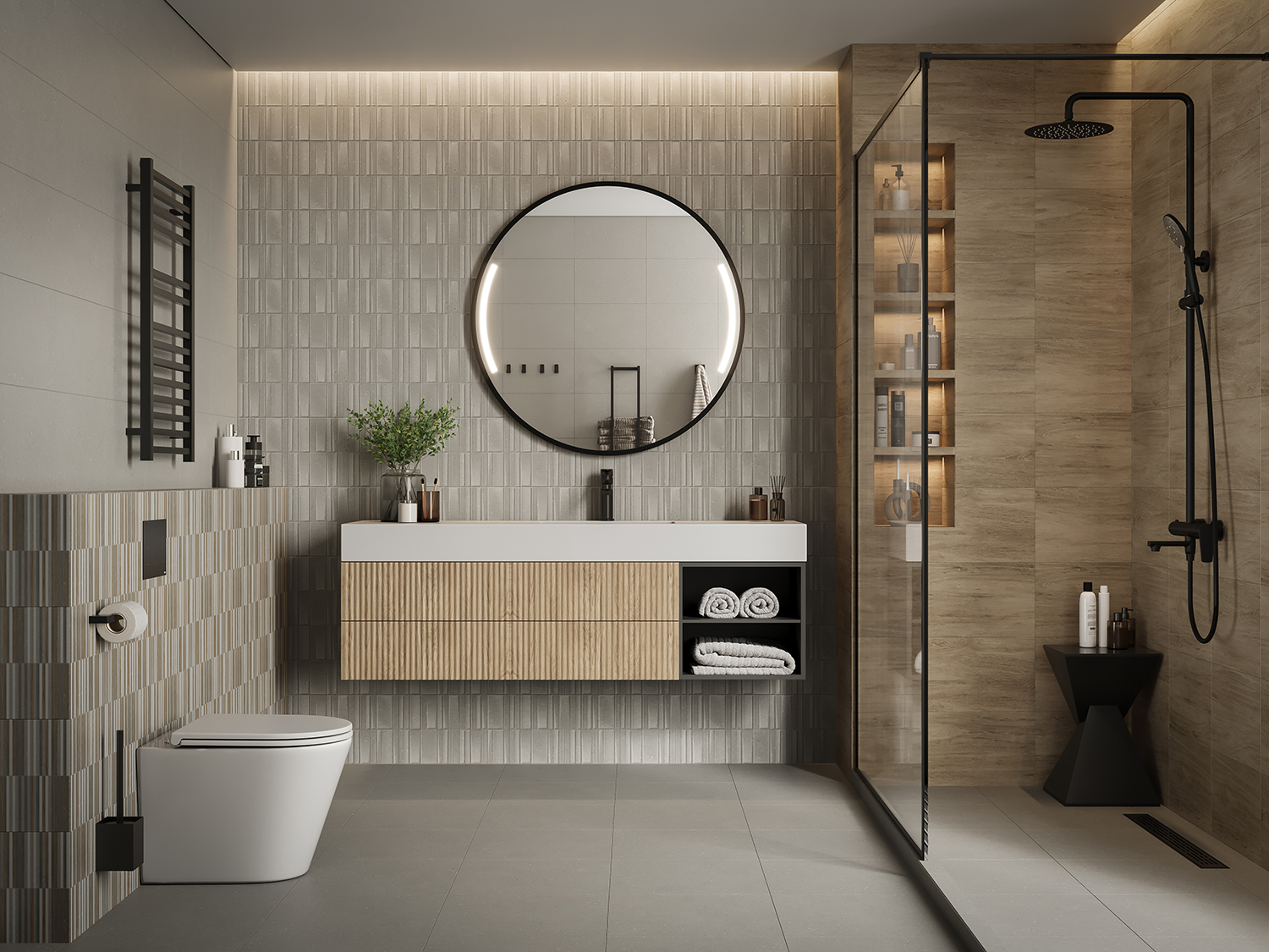 Коллекция «Тренд» — это сочетание текстур современного серого бетона и натурального дерева в мягком, природном оттенке. Коллекция идеально подходит для создания стильного и сбалансированного пространства, объединяющего урбанистическую строгость и природное тепло.