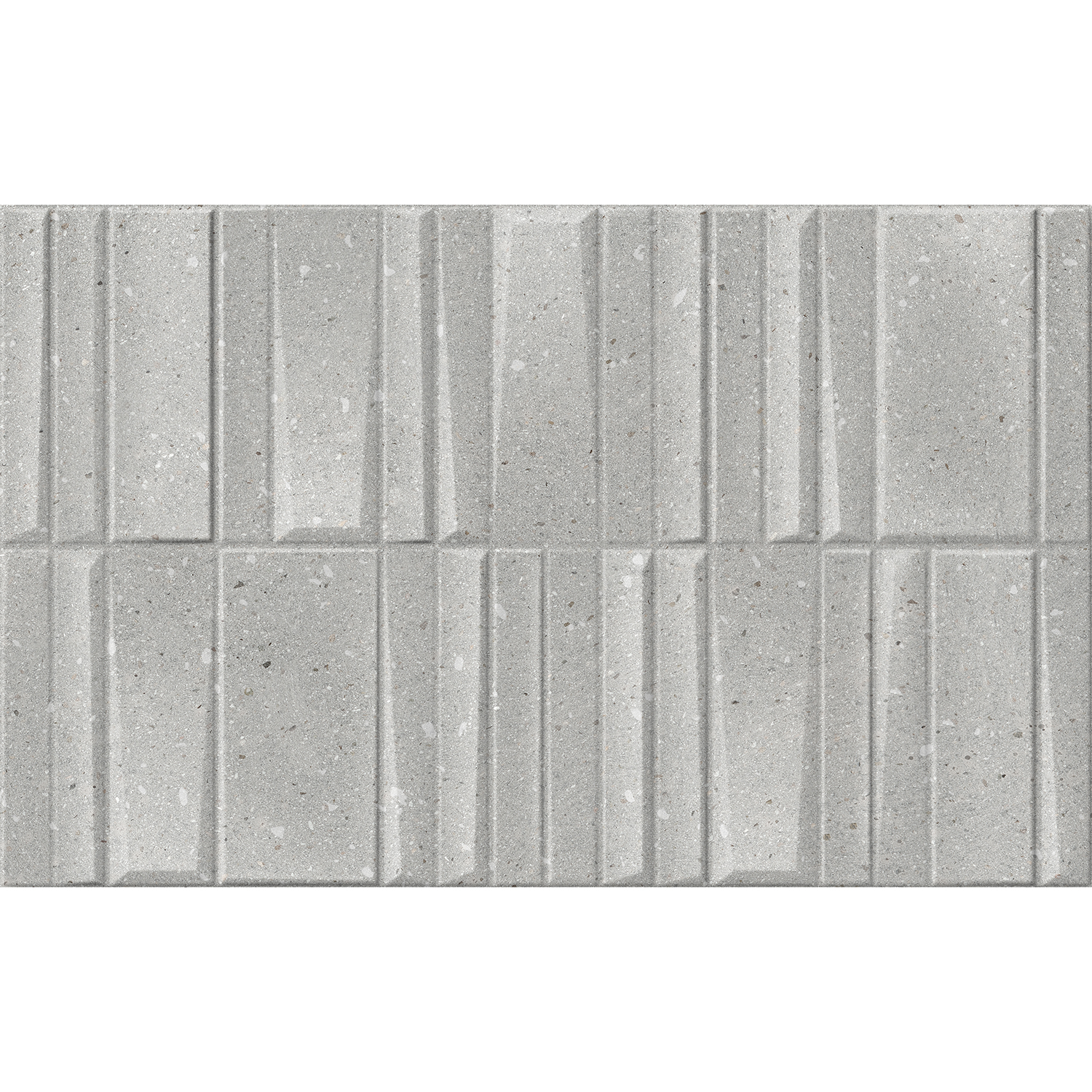 В коллекции также представлен рельефный элемент с текстурой бетона. Геометрия и ритмика вертикально расположенных разнонаправленных прямоугольников перекликаются с ритмикой декоративного фона. Такое сочетание придаёт поверхности дополнительную глубину и подчёркивает современный характер коллекции, а матовая поверхность плит подчёркивает естественность текстур и придаёт пространству спокойный, современный вид.