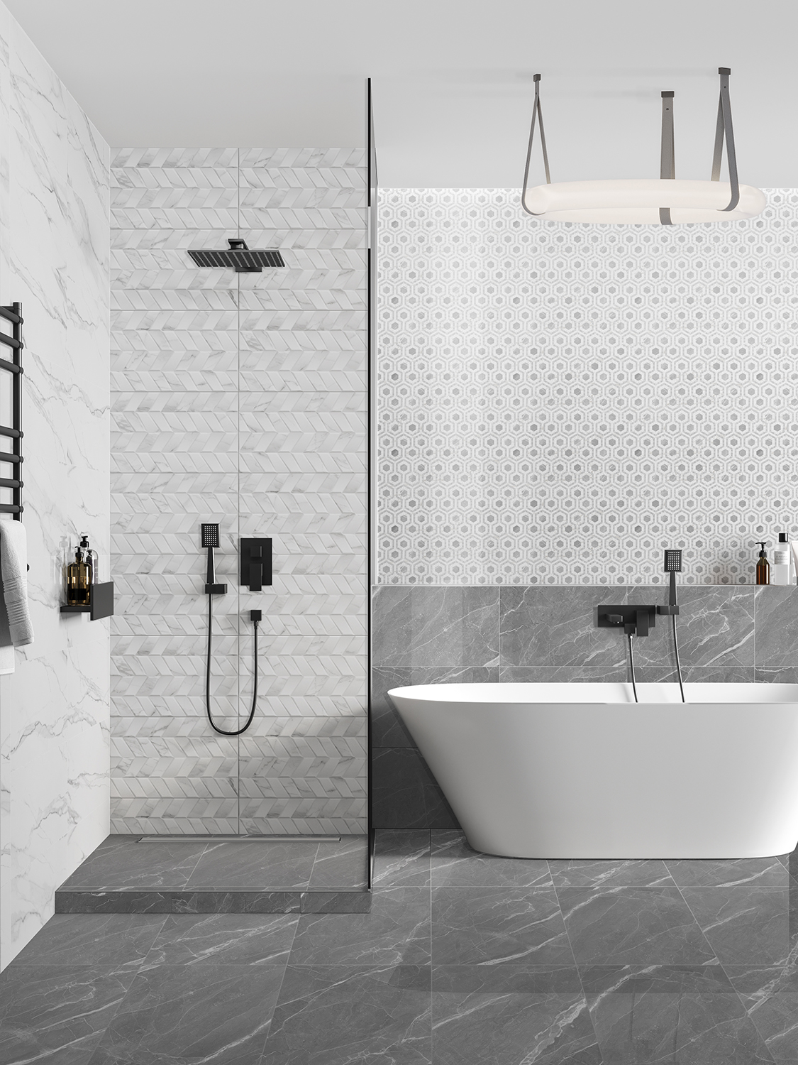 Коллекция «Форте» представляет собой гармоничное сочетание белого и серого мрамора с глянцевой поверхностью, которая подчёркивает природную красоту камня и его характерные прожилки. Этот дуэт позволит создать светлый и уютный интерьер, а также расставить акценты.