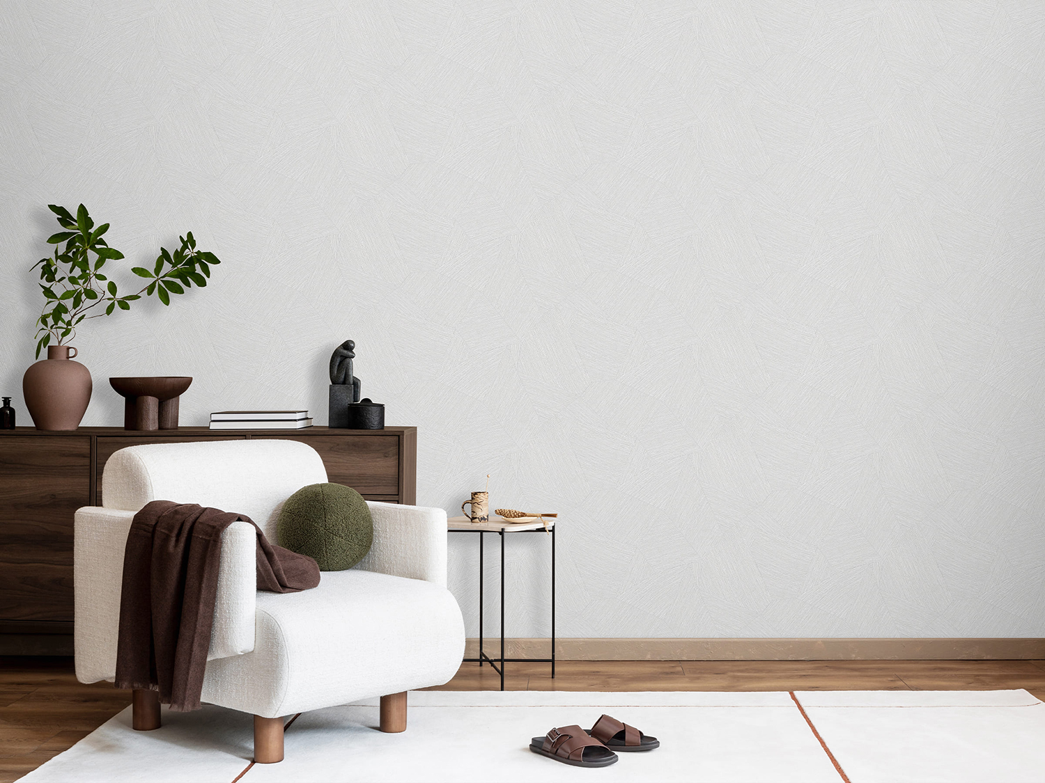 Геометрические формы и мягкие линии фактуры создают атмосферу, где архитектура и декор вступают в гармоничный диалог. Глубоко матовое полотно мотива и фона обладает высоким рельефом, отлично стыкуется и скрывает неровности стен. Теплые, натуральные оттенки обнимают ваш интерьер, наполняя его уютом и характером.