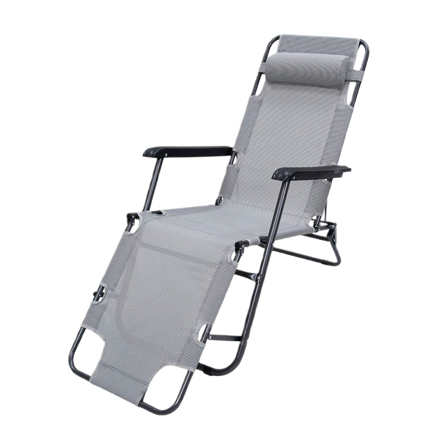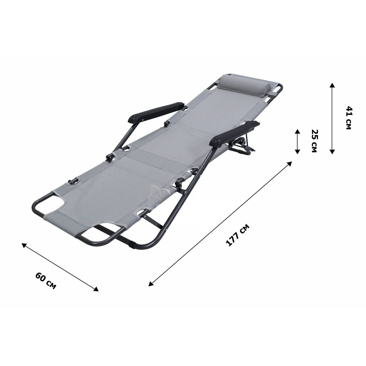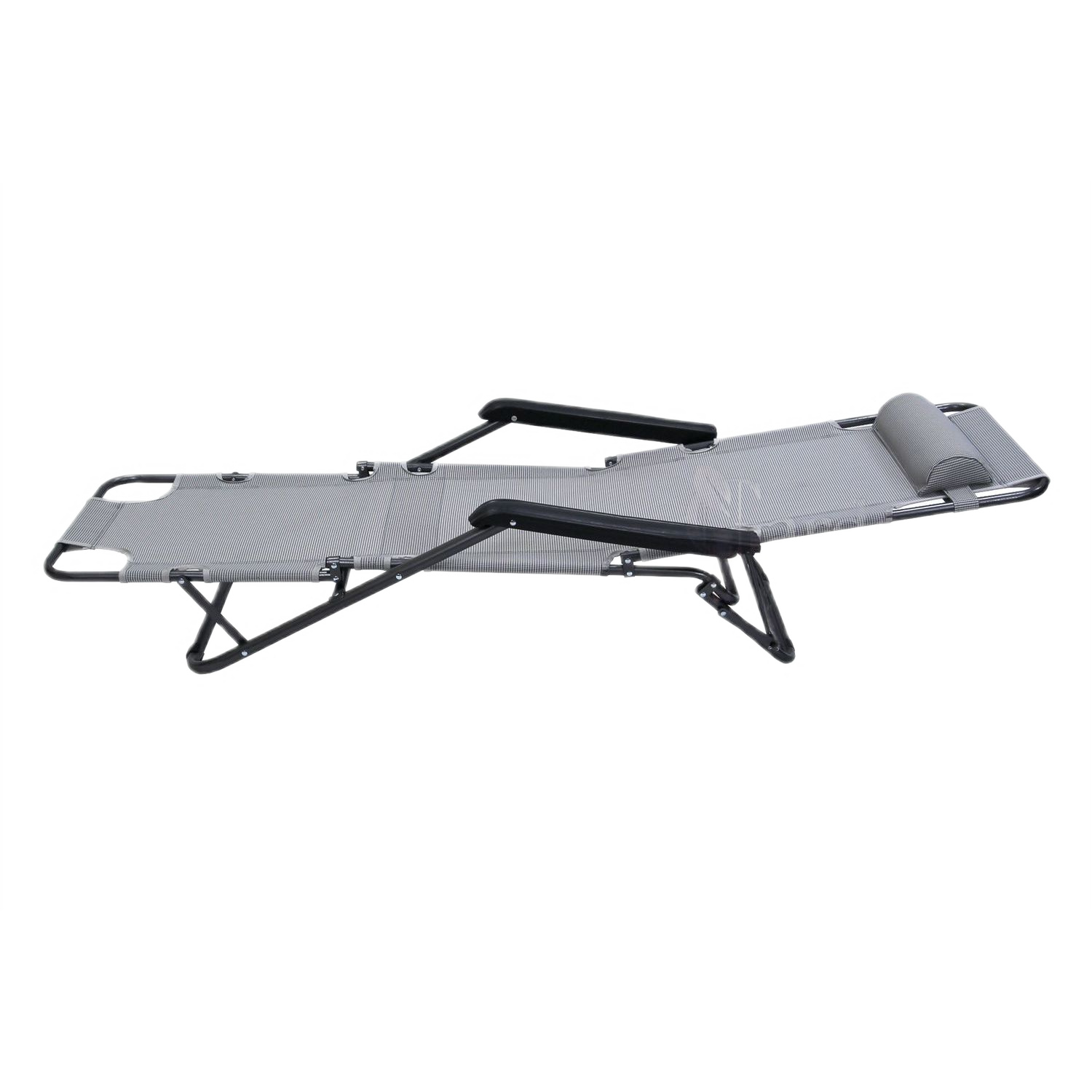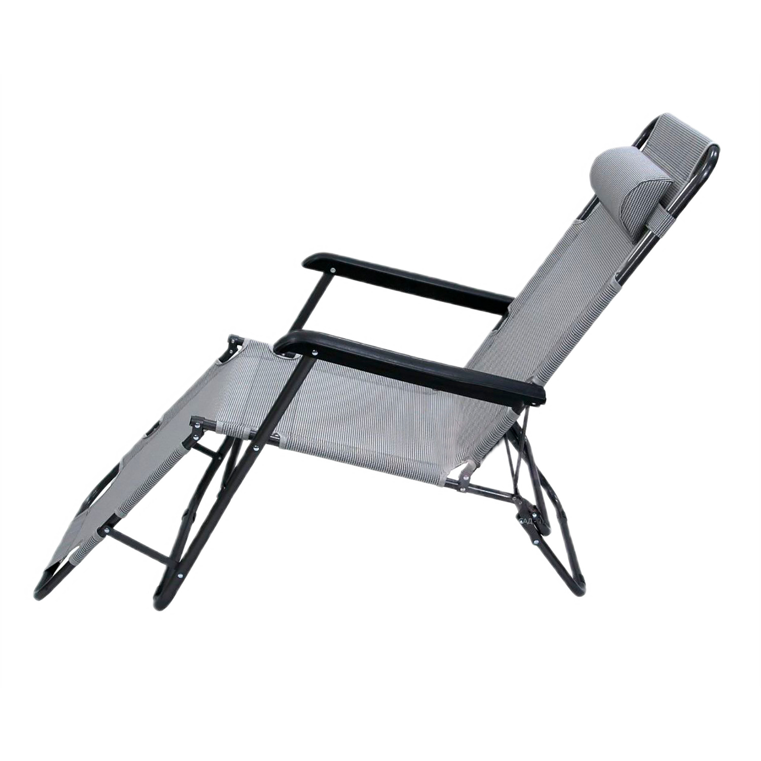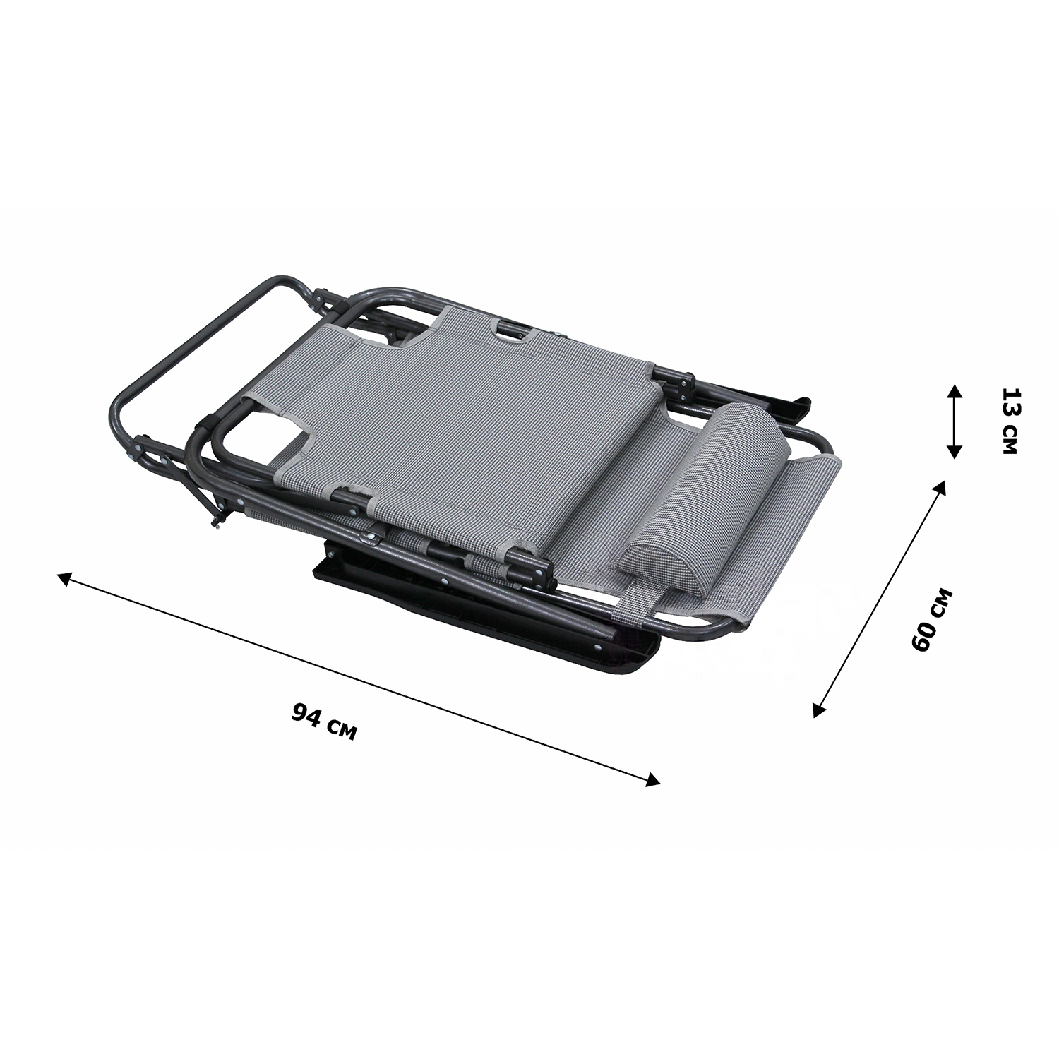 Кресло-шезлонг — это удобное и практичное решение для отдыха. Каркас кресла выполнен из стали с покрытием из порошковой полимерной краски тёмно-серого цвета. Трубы каркаса имеют диаметр 25 мм. Поверхность кресла изготовлена из полиэстера в бежево-серых тонах. Допустимая нагрузка составляет 120 кг, что гарантирует его надёжность и долговечность. Кресло-шезлонг можно разложить в две позиции: полулёжа и лёжа (на 180 градусов).