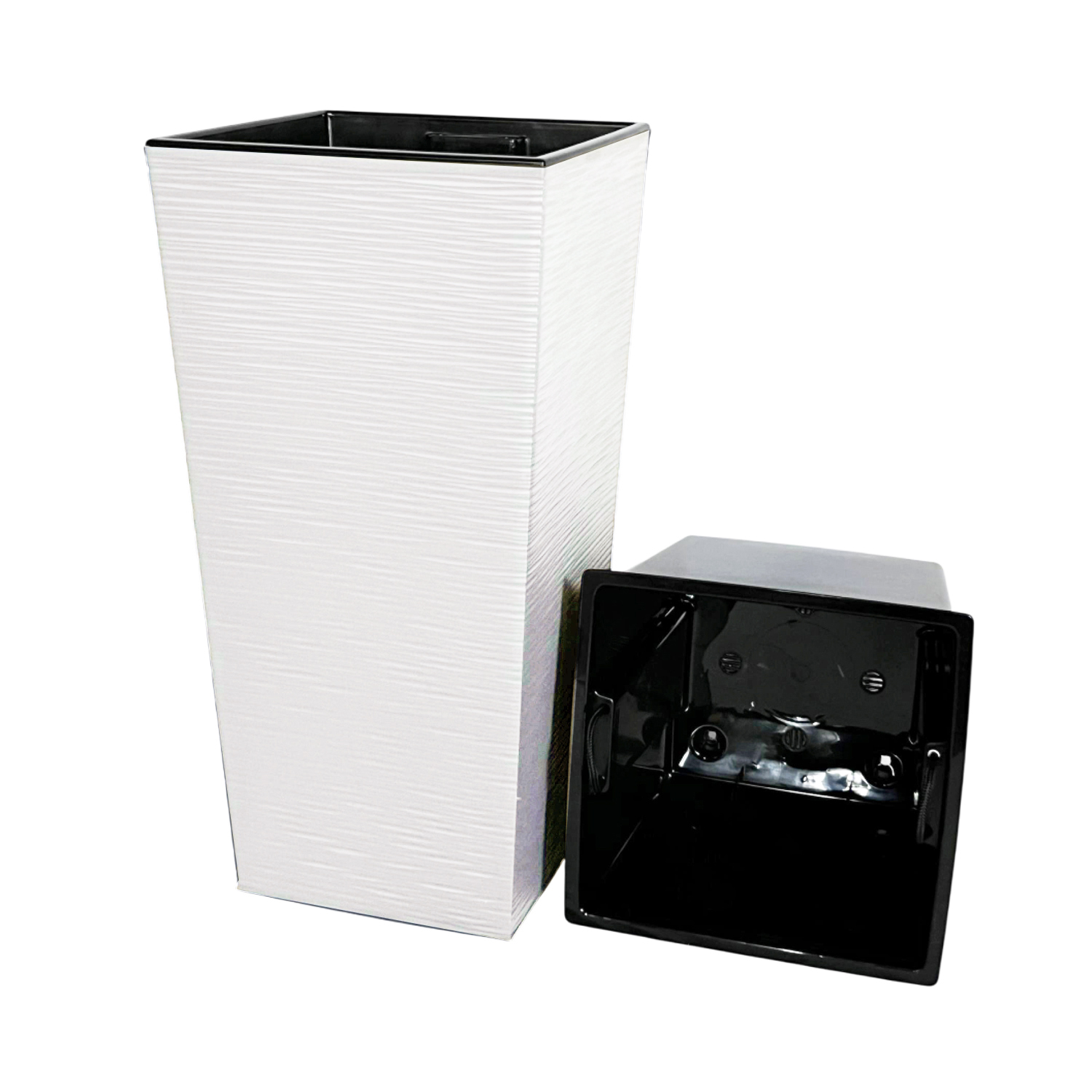 Горшок пластиковый с вкладкой. Поверхность горшка рифленая, вкладка без отверстий. При необходимости их можно сделать самостоятельно. Перед посадкой, необходимо использовать дренаж.
