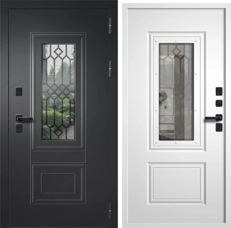 Дверь стальная FLYDOORS Шторм Термо СП-1 – эталон безопасности и энергоэффективности для любого дома. Модель с двухсторонней отделкой «букле чёрный/velluto bianco» сочетает в себе строгий дизайн и современные технологии.
