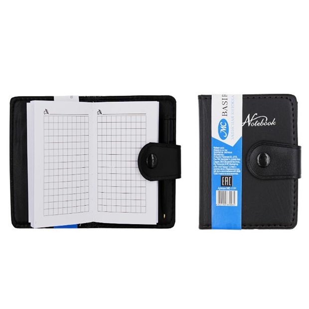 Записная книжка на кнопке с ручкой, мягкая черная обложка под кожу (материал-кожезаменитель) с линовкой-клетка позволяет использовать как недатированный ежедневник.