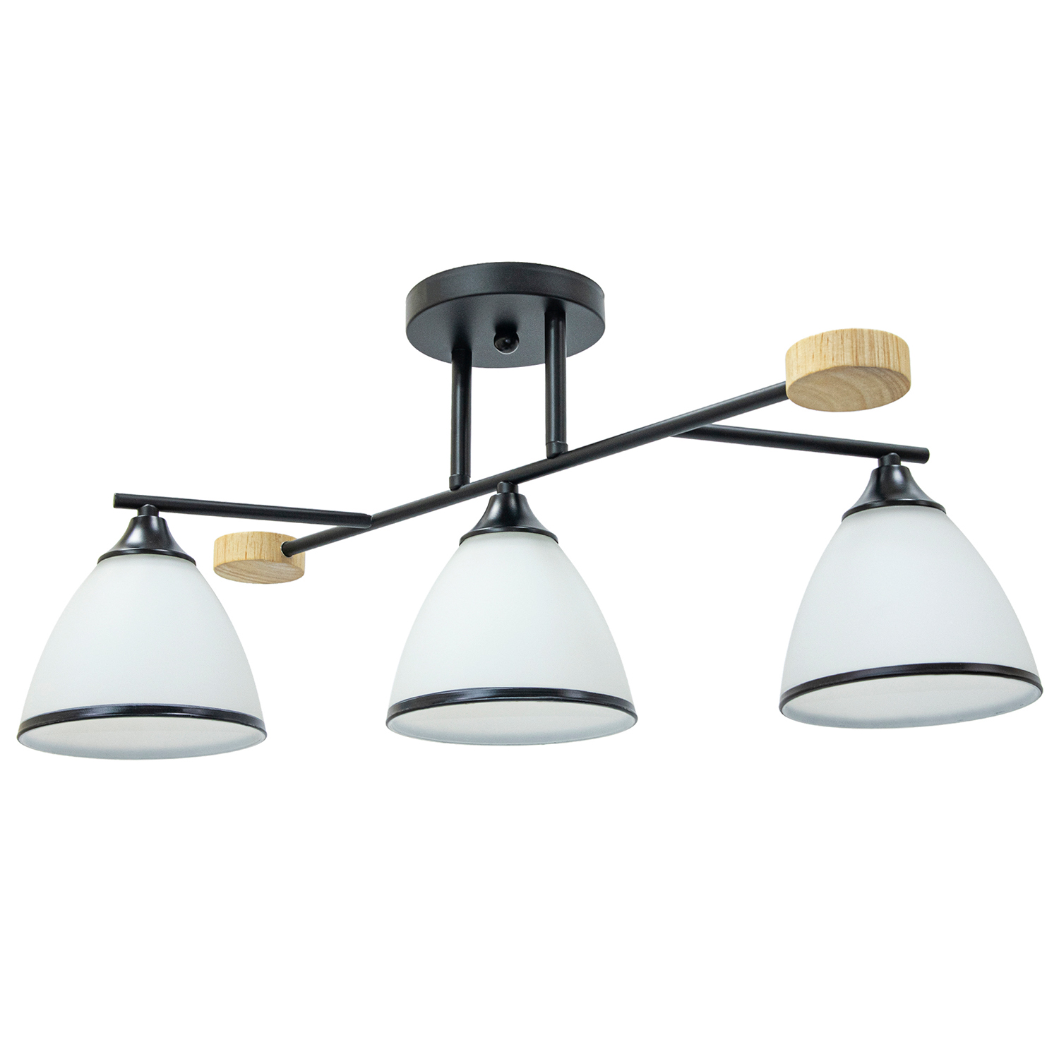 Люстра потолочная на 3 светоточки с круглым основанием и деревянными декоративными элементами в виде круга. Предназначена для освещения бытовых помещений лампами накаливания или светодиоидными лампами. Рассеиватели выполнены из матового стекла белого цвета с черной каёмкой по краям, обеспечивая мягкое и приятное освещение, не раздражающее глаза.