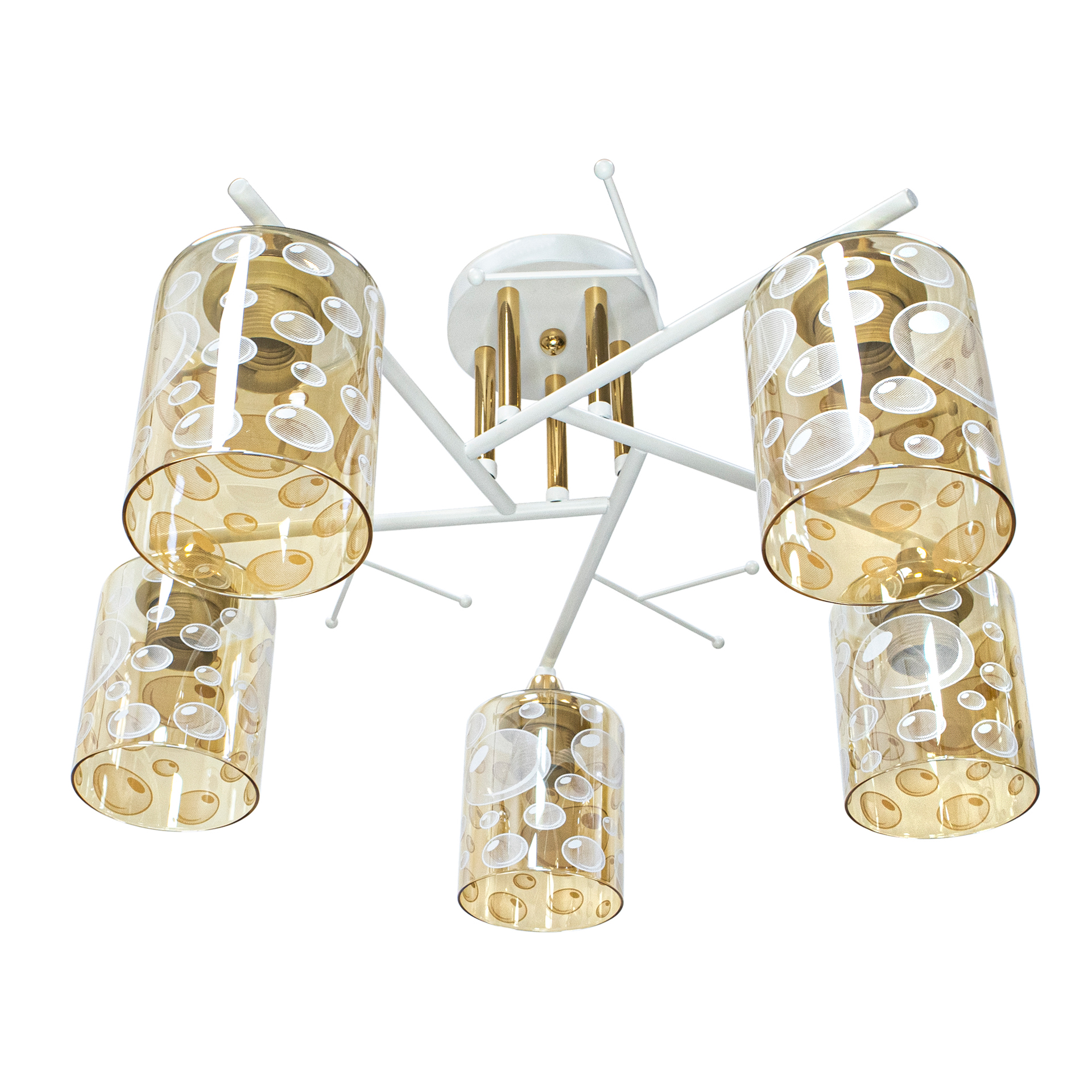 Люстра потолочная c круглым основанием и цельнолитой арматурой с 5-ю рожками. Имеет небольшой металлический декор в виде геометрической ветки. Предназначена для освещения жилых помещений лампами накаливания или светодиодными лампами. Рассеиватели представляют собой круглые, прозрачные цилиндры из желто-коричневого стекла с рисунком в виде пузырей по всей поверхности рассеивателя белого цвета.