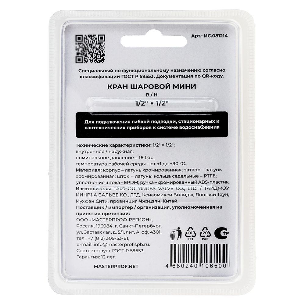 Кран шаровый MASTERPROF Мини ВР-НР 1/2" ИС.081214