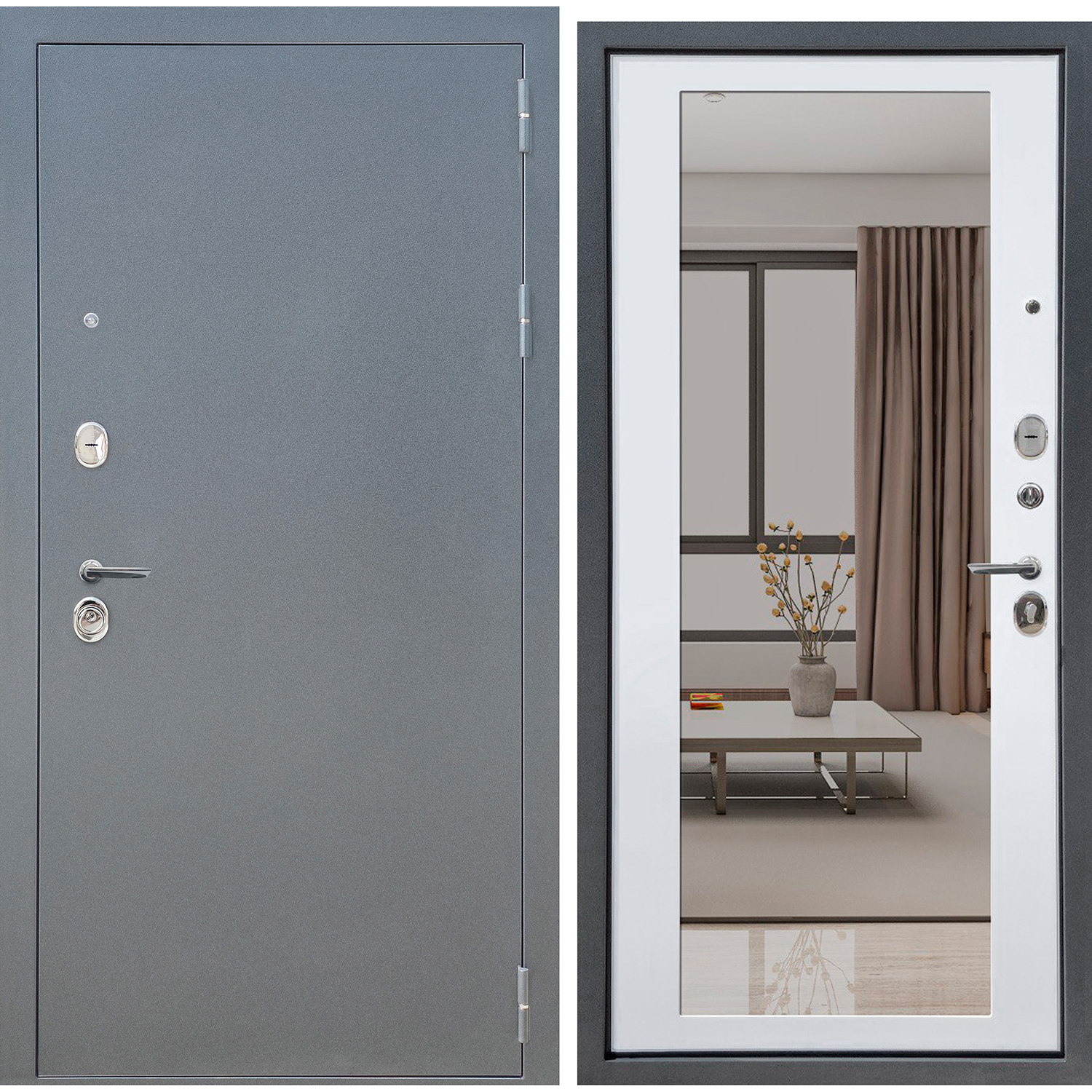 Теплоизоляция полости двери выполнена из пенополистирола, а лицевая сторона покрыта порошково-полимерным слоем цвета букле графит, придающим двери элегантный и стильный вид. Внутренняя отделка выполнена из панели МДФ с дополнительным зеркальным элементом, что придает помещению особый шарм и визуально увеличивает пространство.