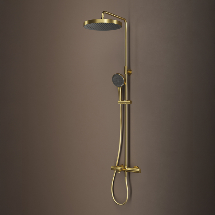 Душевая система с термостатом, тропическим и ручным душем и изливом Duna – воплощение актуальных трендов в дизайне смесителей в безупречном исполнении: фрезеровка, модные цвета и фактуры. Ручка выполнена из латуни для сохранения чёткости линий фрезеровки.