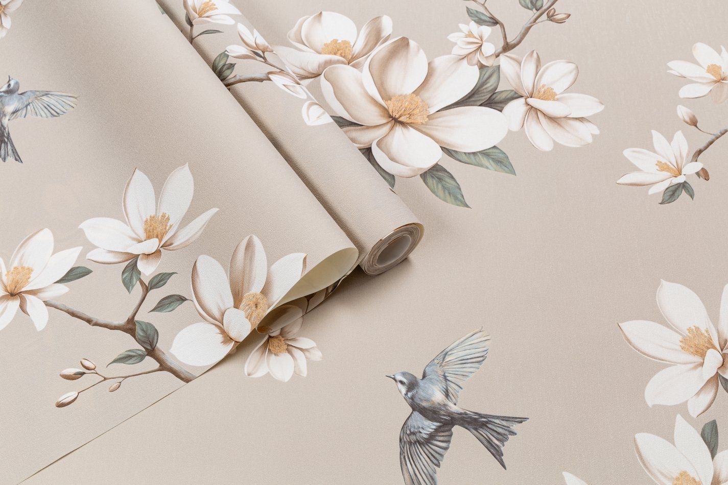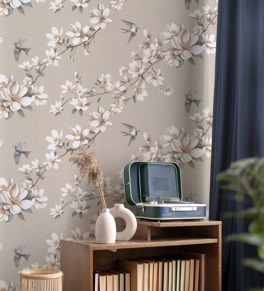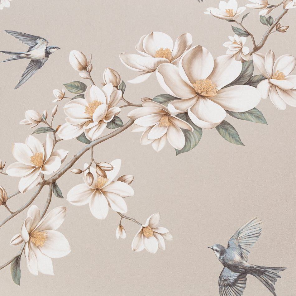 Очарование сада с цветущими магнолиями и порхающими птицами. Авантажную тему обоев Magnolia составляют изящные соцветия магнолии и веселое щебетание порхающих в воздухе птиц – весенний мотив, который наполнен светлой радостью от пробуждения природы.