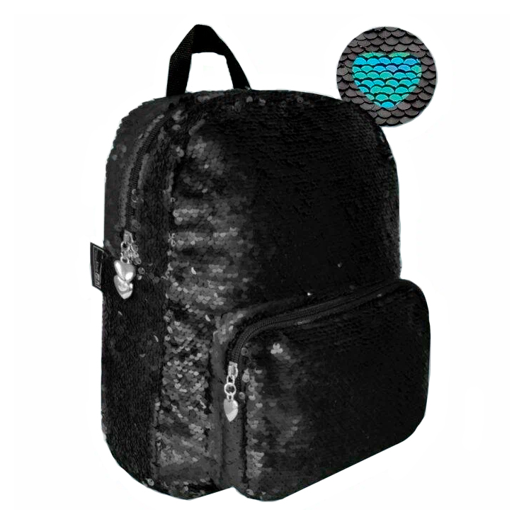 Рюкзак изготовлен из ткани, расшитой красивыми матовыми двухсторонними пайетками (одна сторона – черная, другая – зеленая), которые придают ему интересный и привлекательный внешний вид. Основной отсек рюкзака, закрытый на молнию, вместителен и функционален, идеально подходит для хранения смартфона, ключей, кошелька и других личных вещей. Дополнительно предусмотрен фронтальный карман на молнии, который служит для быстрого доступа к важным мелочам.