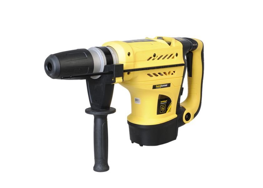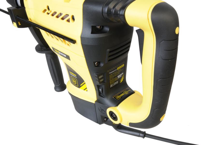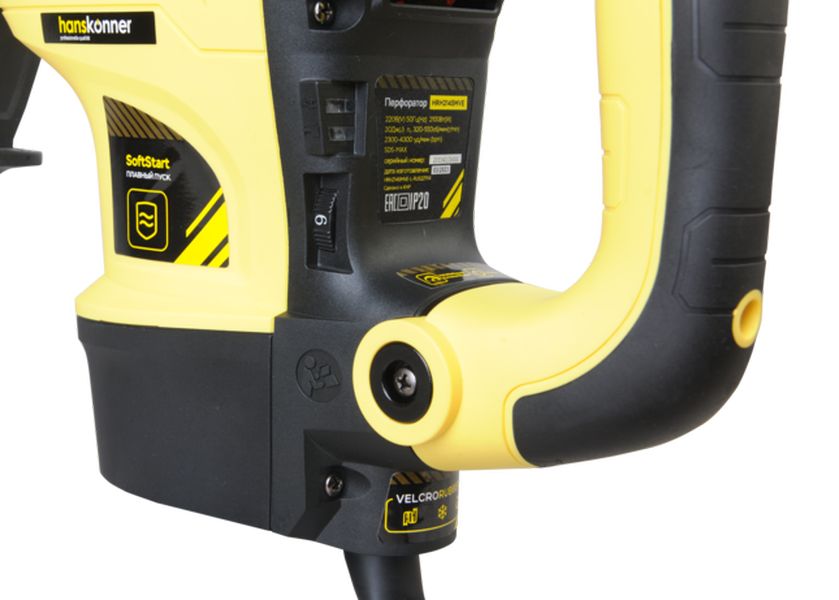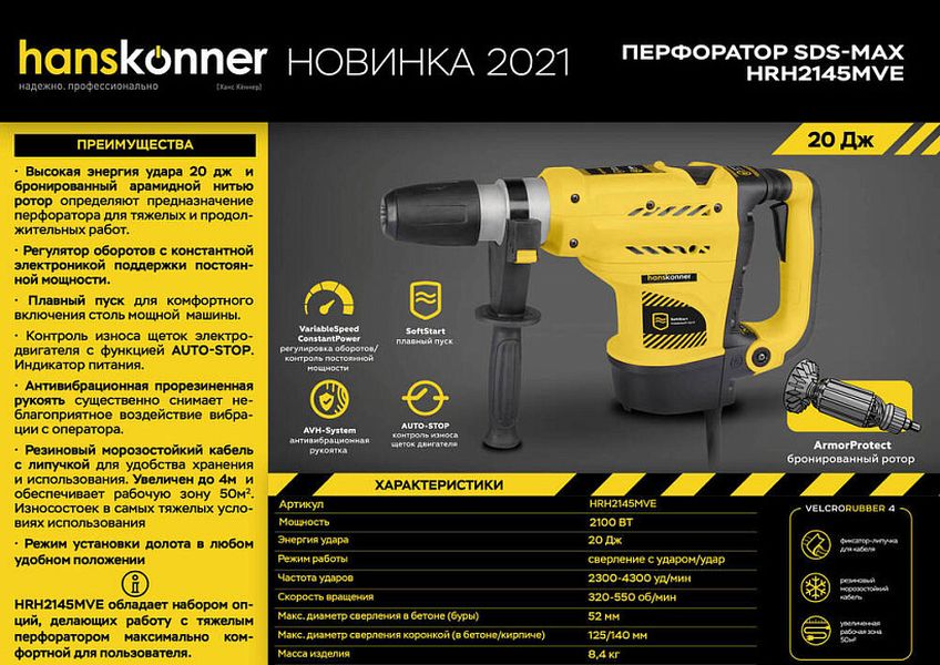 Hanskonner HRH2145MVE – универсальный и производительный перфоратор для тяжелых и интенсивных работ с типом патрона SDS Max. Модель оснащена мощным электродвигателем с дополнительным бронированием арамидной нитью ArmorProtect, защищающим от абразивных частиц и пыли и усиленным ударным механизмом, развивающим энергию удара в 20 Дж – это позволяет с легкостью бурить отверстия до 52 мм в материалах различной твердости, использовать коронки больших диаметров (бетон до 125 мм / кирпич до 140 мм), с максимальной эффективностью осуществлять операции по демонтажу. Важной особенностью модели является наличие в конструкции электронного блока VariableSpeed ConstantPower, обеспечивающего стабильное поддержание оборотов двигателя независимо от нагрузки, а также регулировку оборотов в широком диапазоне. Кроме этого, перфоратор получил фунцию SoftStart, позволяющую плавный запуск. Инструмент имеет два режима работы – в зависимости от поставленной задачи, пользователь может выбирать между сверлением с ударом, либо режимом удара. Смена режимов производится переключателем, размещенным в верхней части корпуса. Благодаря установленной в Hanskonner HRH2145MVE предохранительной кулачковой муфте, предотвращается опасность проворачивания перфоратора в руках в случае заклинивания оснастки в материале. Предусмотрены индикатор сети PowerCheck, оповещающий о подключении инструмента к элекропитанию, а также функция автоматического отключения щеток AutoStopBrush. защищающая коллектор от повреждений при критическом уровне щеточного износа. Комфорт пользователя при продолжительной работе обеспечивает прорезиненная антивибрационная рукоять со специальным амортизатором, значительно снижающим неблагоприятное воздействие вибрации. Сетевой кабель имеет резиновую изоляцию, что сохраняет его гибкость и эластичность в условиях низких температур, а четырехметровая длина кабеля дает возможность использовать инструмент без применения дополнительного сетевого удлинителя, гарантируя рабочую зону площадью до 50 квадратных метров. Для удобства фиксации кабеля предусмотрен ремень-липучка. Модель комплектуется вместительным пластиковым кейсом для хранения и транспортировки инструмента и аксессуаров.