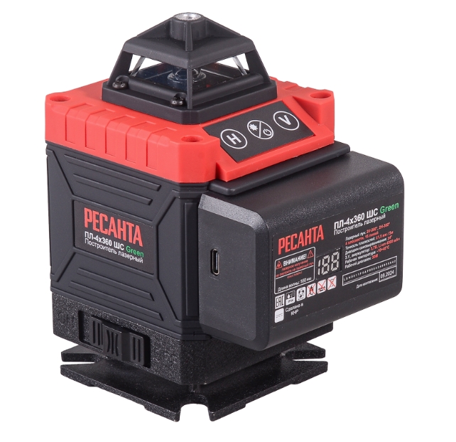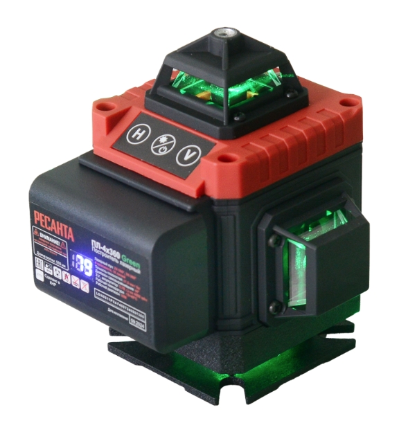 Построитель лазерный ПЛ-4Х360ШС Green Ресанта - измерительный прибор, который позволяет выполнять измерительные задачи в строительстве: построение горизонтальной и вертикальной плоскостей для выверки и контроля правильности взаимного расположения плоскостей, установки угла в 90 градусов между плоскостями. Прибор позволяет контролировать неровность поверхности относительно горизонта и перпендикулярной плоскости.