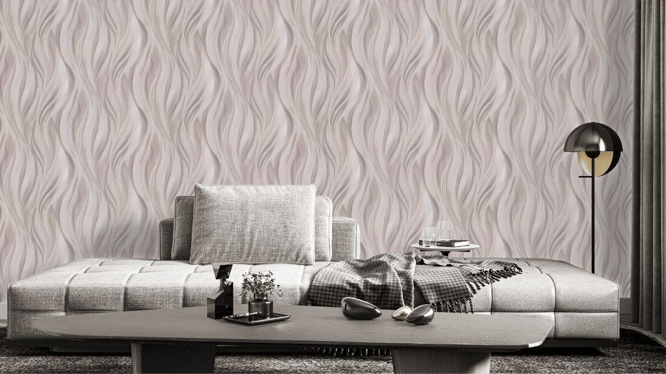 В коллекции Protect-Flame рисунок в виде мягко струящихся волн имитирует живые языки пламени. Благодаря вертикальной направленности он визуально вытягивает потолок. Детально проработанные тисненые линии мягко переходят одна в другую, создавая эффект движения. Природная энергия огня воплощена в миксе перламутрового напыления с матовыми элементами и в плавном переходе оттенков.