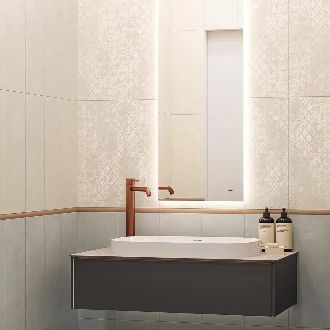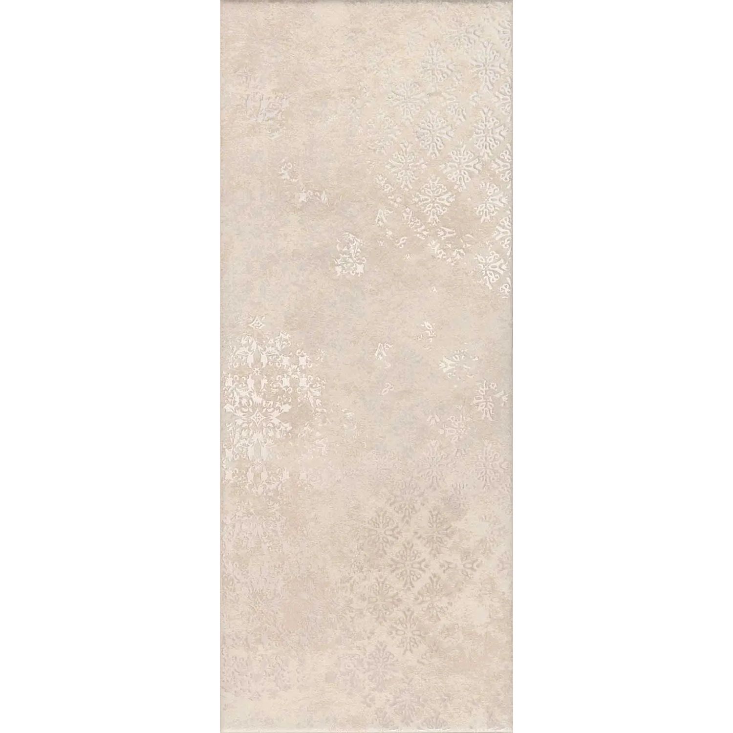 На декоративной плитке 20х50 воспроизведена благородная старина, характерная для Венеции. На бетонную основу словно наброшено тонкое кружево — ещё один очень венецианский мотив. Декоры выполнены с применением металлизированной краски, отчётливо проступающей на свету.
