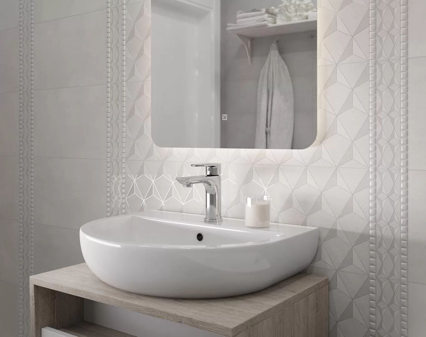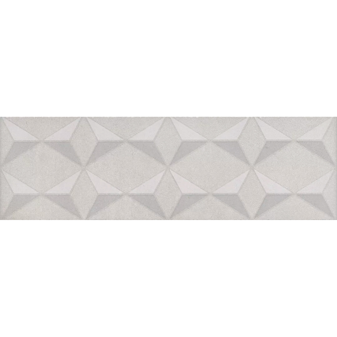 Если дополнить базовую плитку декоративными элементами — декорами и бордюрами, интерьер мгновенно преобразится. Рисунок с 3D-эффектом создаёт объём, который изменяется в зависимости от угла зрения. Четкие контуры геометрического паттерна покрыты глянцевым составом.