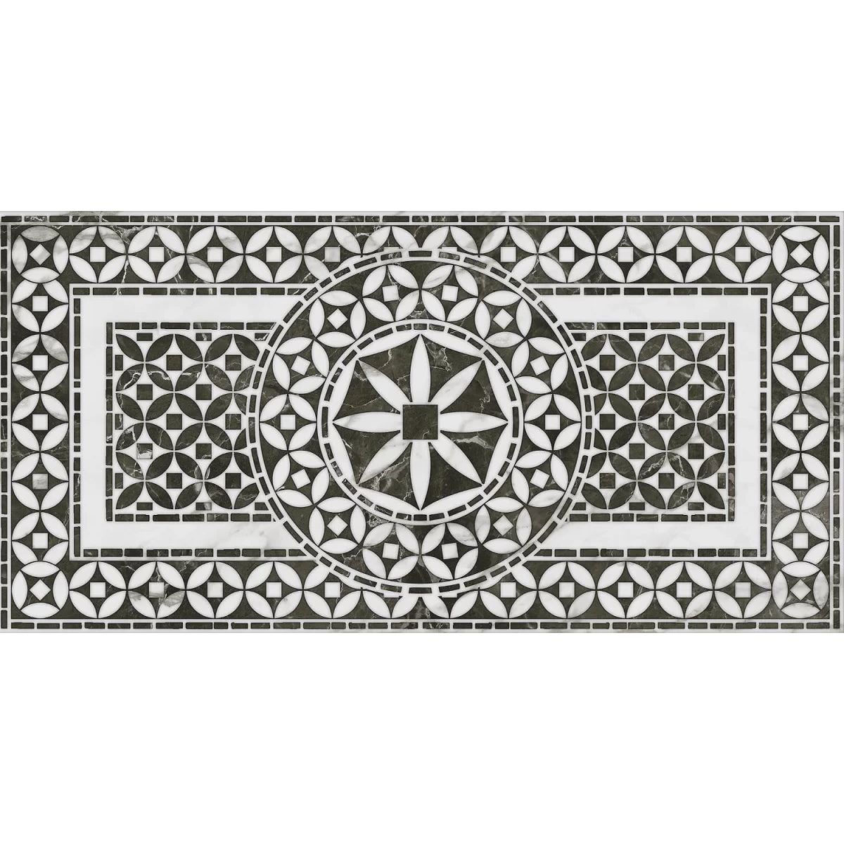 Контраст чёрного и белого мрамора — беспроигрышный вариант для создания обстановки. Ещё одно оригинальное декоративное решение, впервые предложенное в этой серии, — своеобразный «дуэт» плитки с отверстием и совпадающих с ним круглых элементов для включения в композицию собственных наборных декоров.