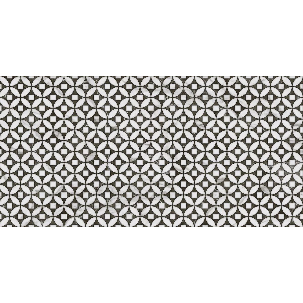 Контраст чёрного и белого мрамора — беспроигрышный вариант для создания обстановки. Ещё одно оригинальное декоративное решение, впервые предложенное в этой серии, — своеобразный «дуэт» плитки с отверстием и совпадающих с ним круглых элементов для включения в композицию собственных наборных декоров.