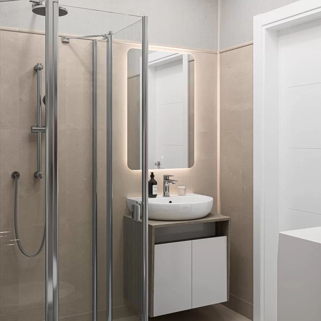 Решения для стены представлены в трех цветах, наиболее популярных для использования в проектах. Это белый, светло-серый и бежевый. В этих цветах выполнена базовая плитка 30х60 с эстетикой камня, а также декоры, где помимо фонового рисунка есть стильный геометрический паттерн.