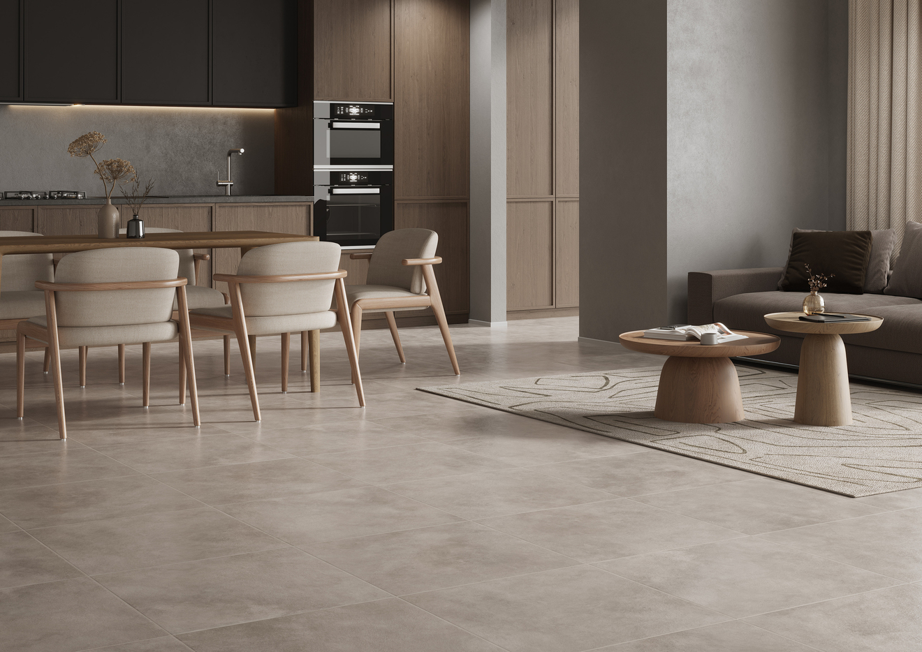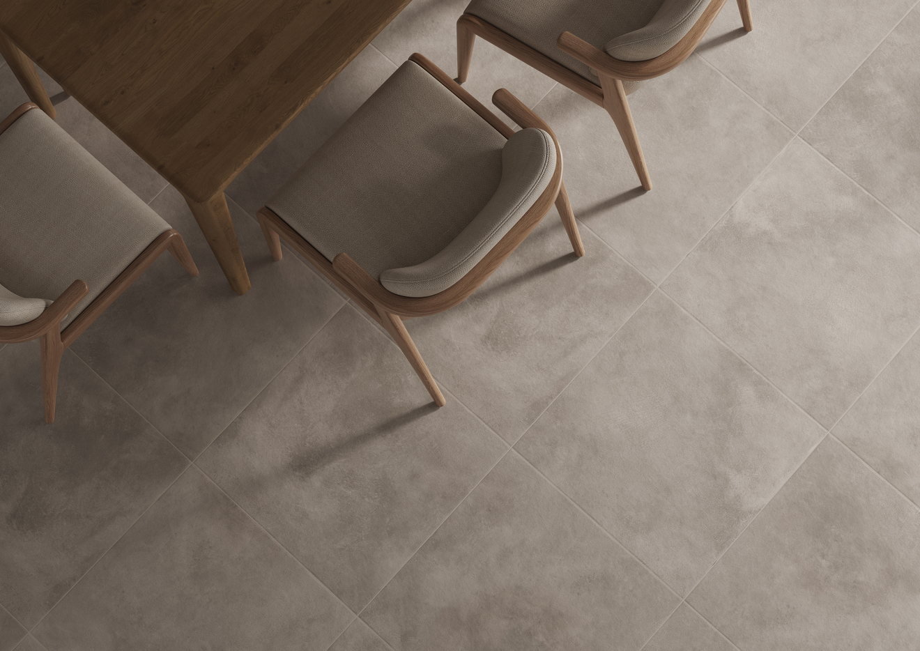 В коллекцию Residence входит керамогранит под бетон в двух мягких и приятных оттенках. Матовая текстура с лёгким рельефом реалистично имитирует натуральную бетонную поверхность с небольшими выемками, подходящую для отделки современных интерьеров.