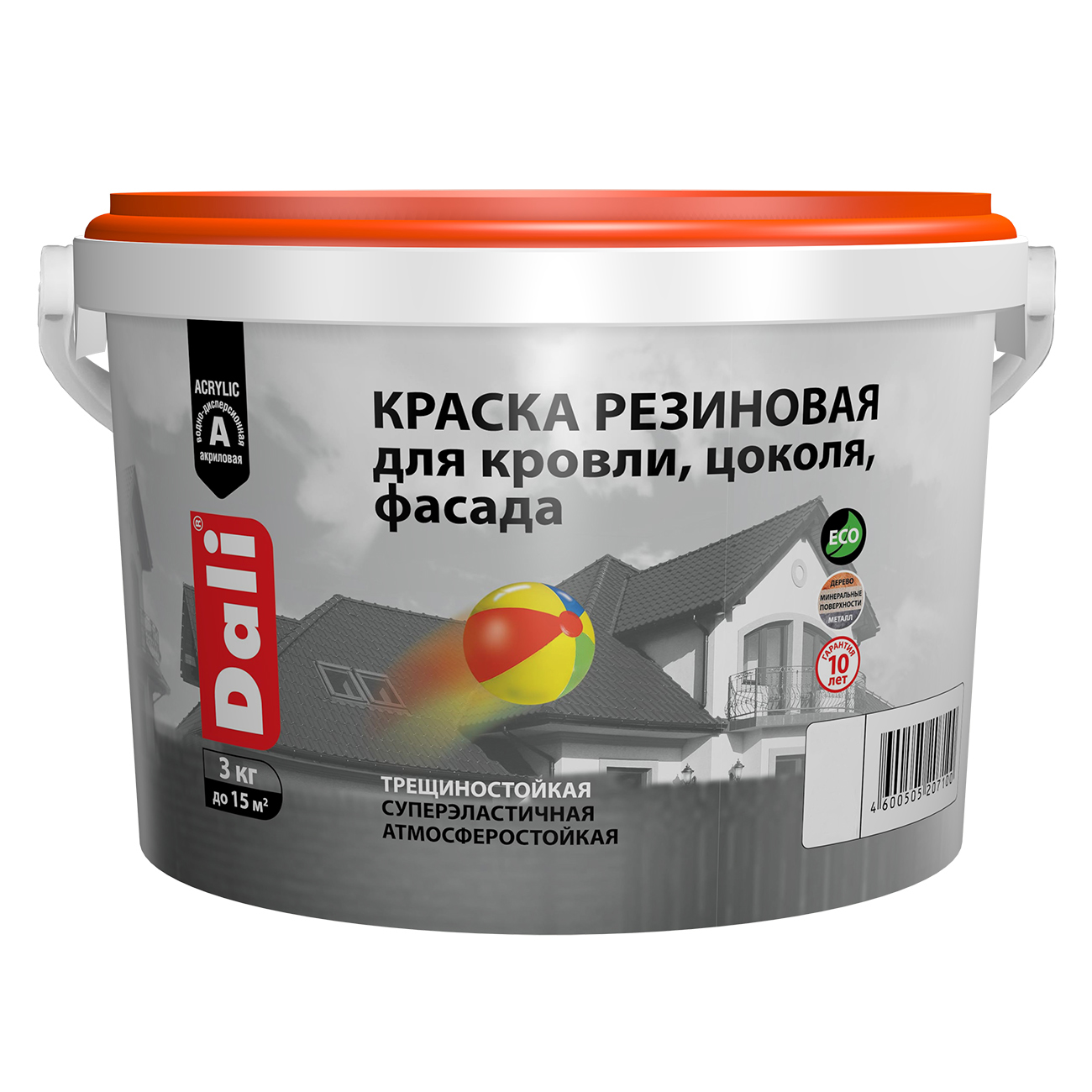 Краска DALI Резиновая предназначена для защитно-декоративного окрашивания крыш, фасадов, цоколей, а также стен и потолков в жилых и общественных помещениях, включая объекты с повышенной влажностью, неотапливаемые и подверженные образованию трещин.