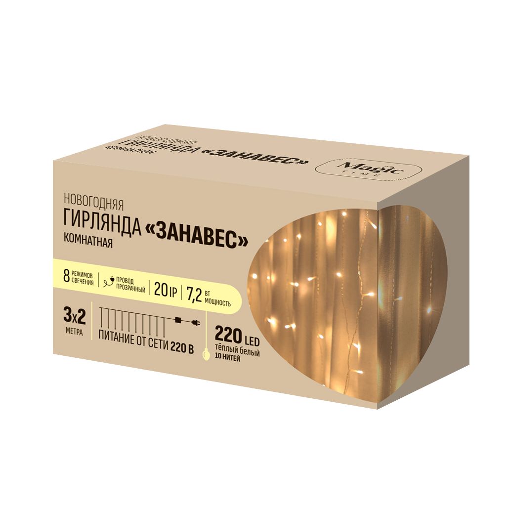 LED-гирлянда Занавес с тёплым белым свечением предназначена для использования в интерьере помещений, оснащённая защитой класса IP 20, обеспечивающей её стабильную работу в условиях закрытого пространства, будь то жилое помещение, ресторан или магазин. Особый шарм и уют создаётся благодаря 220 качественным LED-лампочкам тёплого белого света, которые мягко озаряют пространство, имитируя естественный дневной свет и усиливая приятное восприятие интерьера.