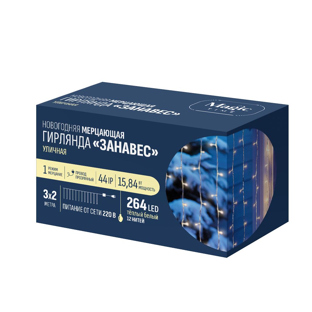 Новогодняя электрогирлянда Занавес — идеальное решение для праздничного оформления интерьера и экстерьера. 264 LED-лампочки обеспечат красивое и оригинальное дополнение к общей концепции декора. Особенности гирлянды включают в себя эффект мерцания, созданный конструкцией из 12 нитей.