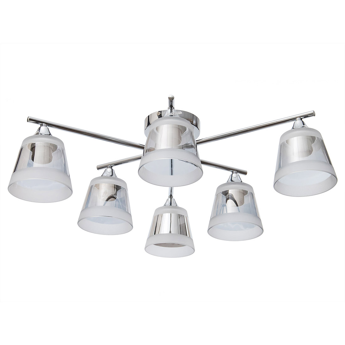 Потолочная люстра предназначена для освещения бытовых помещений площадью 18-22 кв.м. Модель имеет круглое основание и три прямых кронштейна, на каждом из которых расположено по два плафона. Конструкция выполнена в цвете хром (гальваника). Рассеиватели — стеклянные, прозрачно-матовые, имеют форму трапециевидного конуса серого цвета. Люстра поддерживает использование ламп накаливания или светодиодных ламп.