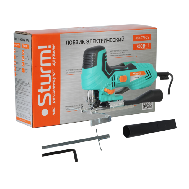 Sturm JS4075QS – компактный универсальный электрический лобзик. Характеризуется оптимальными массогабаритными показателями и выверенной эргономикой. Благодаря грибовидной рукояти, обеспечивается наилучший контроль инструмента при выполнении точных и сложных фигурных резов. Лобзик оснащен 750 Вт электромотором и надежной механической частью – позволяет выполнять пропилы до 65 мм в древесине, и до 5 мм в металле. Возможность точной настройки инструмента применимо к конкретному материалу обеспечивают электронная система регулировки ходов штока (800 – 3000 ход / мин), а также, функция маятникового хода с четырьмя режимами – с помощью специального переключателя пользователь выбирает оптимальный режим работы с упором на максимальную производительность, либо максимальное качество реза с наименьшим количеством сколов. Модель получила усиленную литую силуминовую платформу, стойкую к деформациям и механическим повреждениям.