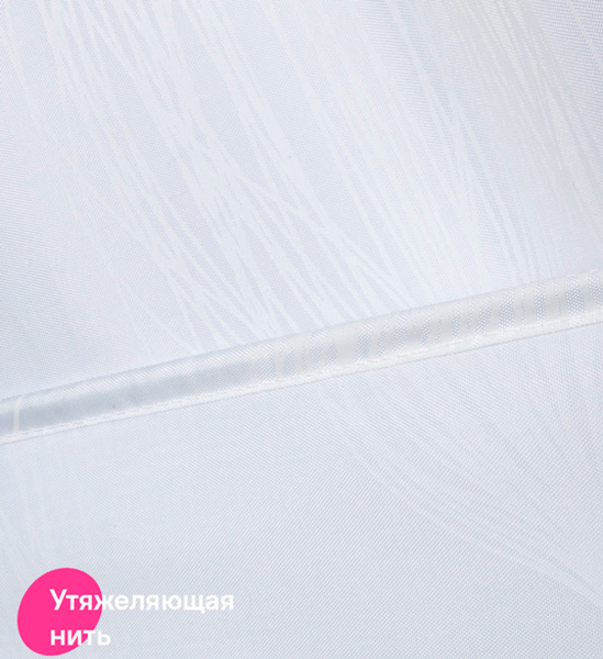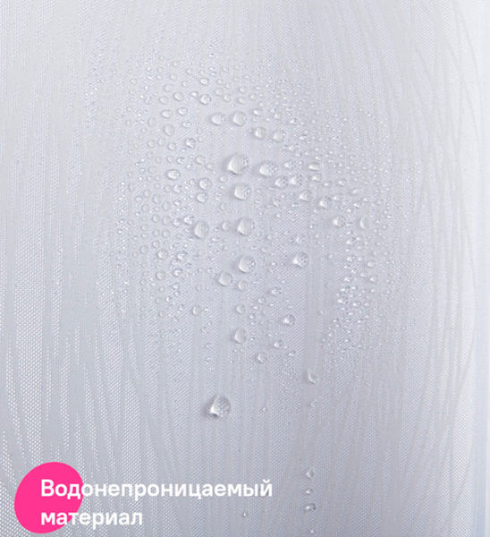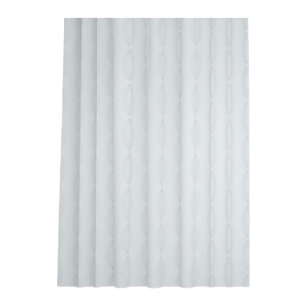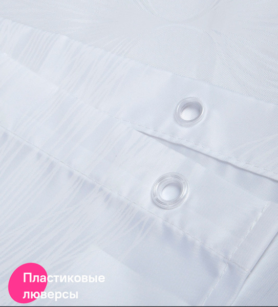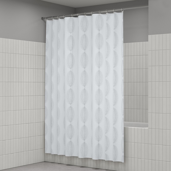 Текстильная штора для ванной белого цвета с ненавязчивым узором гармонично впишется в классический и современный интерьер. Изготовлена из износостойкого полиэстера с водоотталкивающей пропиткой. При попадании на ткань вода не впитывается, а скатывается каплями, даже при сильном напоре воды.