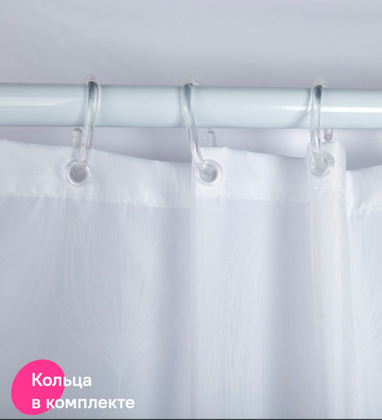 В комплекте 12 колец С-формы из прозрачного пластика. По верхнему краю расположены 12 прозрачных пластиковых люверсов. Штора имеет утяжеляющую нить по нижнему краю, которая позволяет избежать задирания ткани.