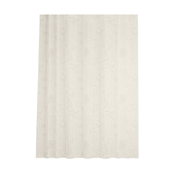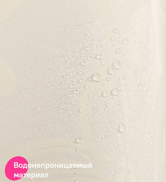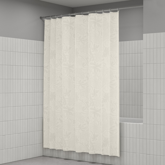 Текстильная штора для ванной нежного сливочного цвета с деликатным цветочным узором выглядит элегантно и подойдет к интерьеру в любом стиле и цветовой гамме. Изготовлена из износостойкого полиэстера с водоотталкивающей пропиткой. При попадании на ткань вода не впитывается, а скатывается каплями, даже при сильном напоре воды.
